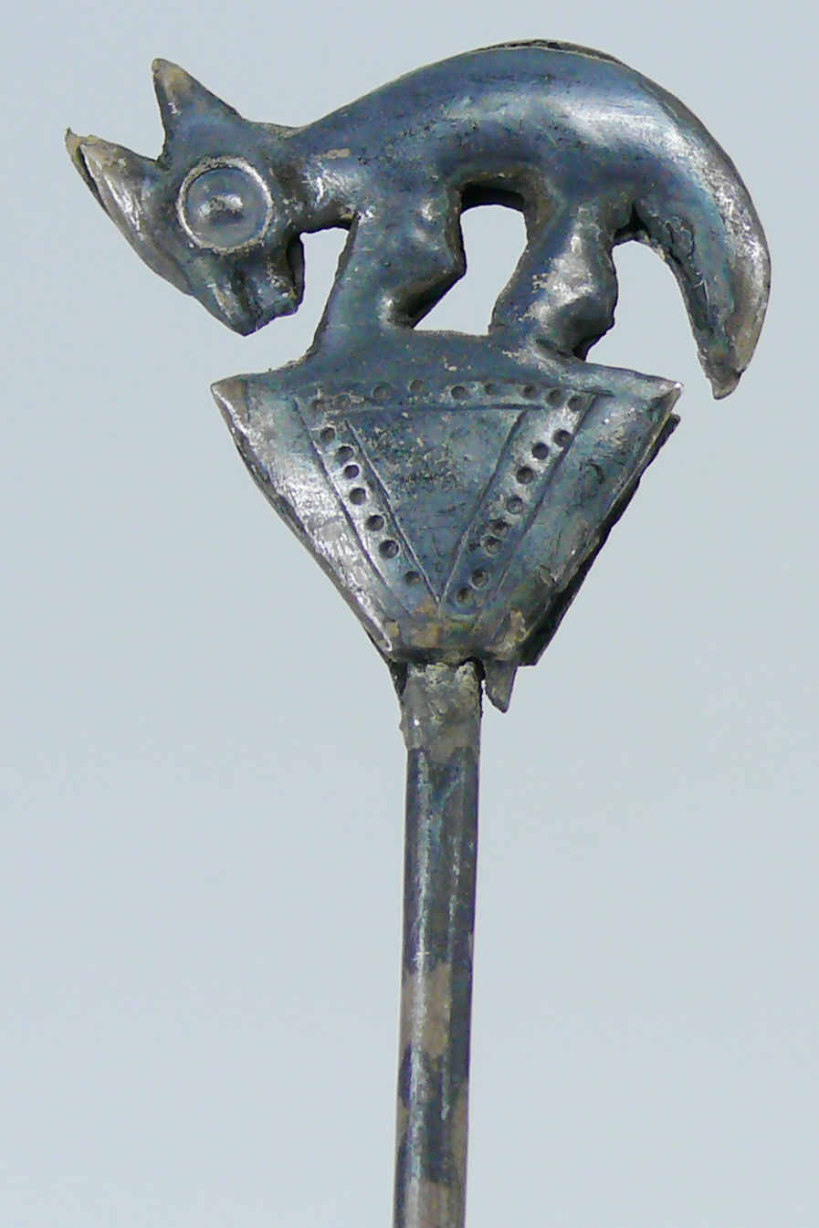 Grande épingle à cheveux en bronze, ornée d’un renard. Le motif est argenté. 225 mm.