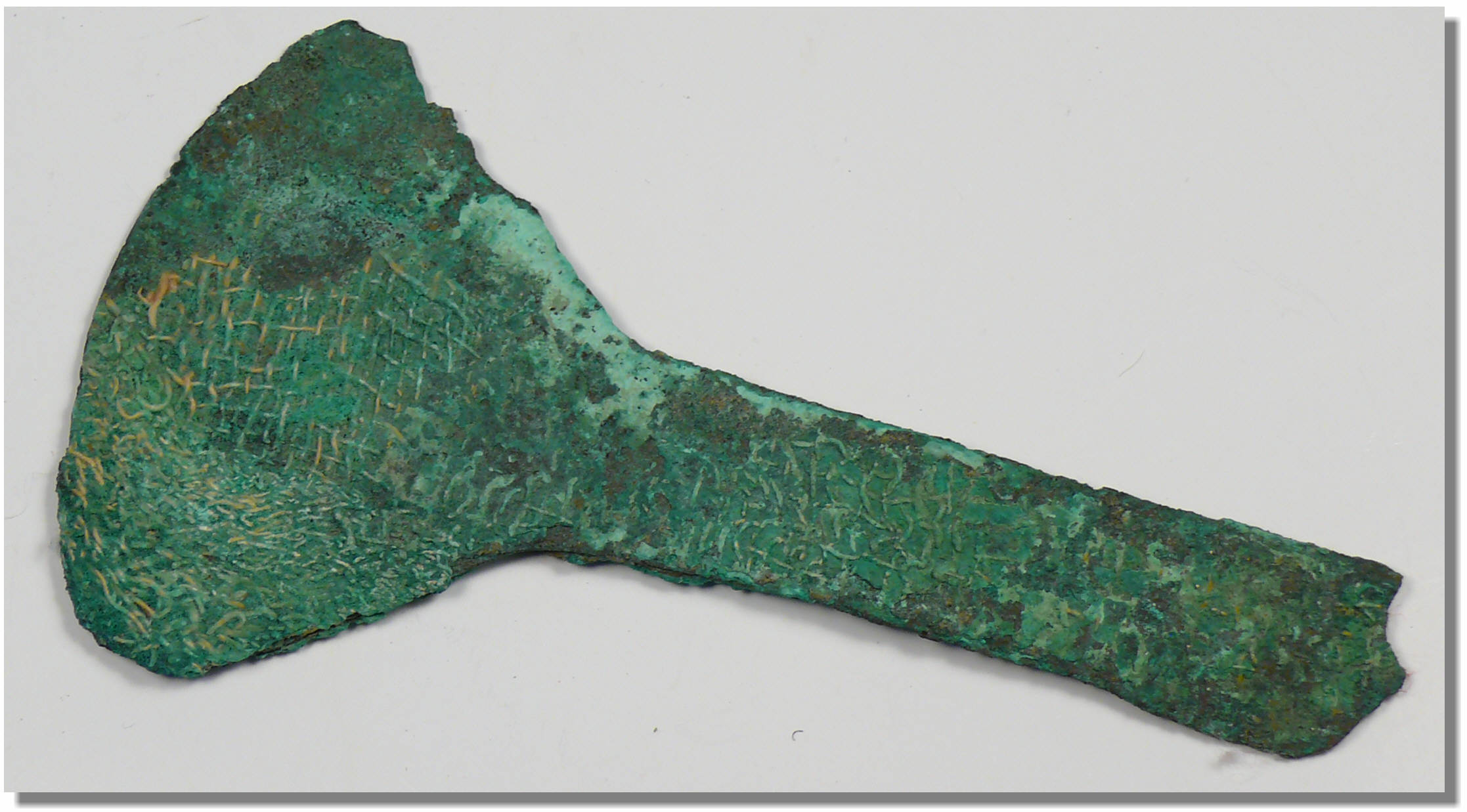 Avers : Hâche votive qui accompagnait les morts dans l’au-delà. L’objet a encore des petits fragments de linceul, collés sur ses parois – 11 mm.