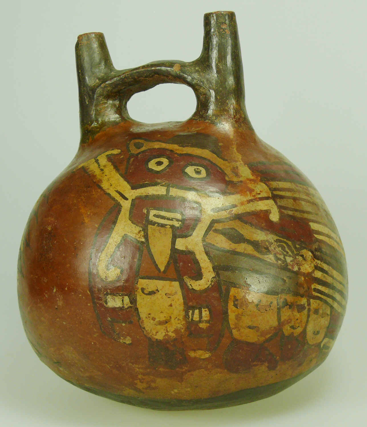 Important vase à double bec en terre cuite, dont le décor représente des monstres mythiques. Quatre têtes d’hommes sous la représentation du masque. Très belle engobe brillante marron. 180 mm.