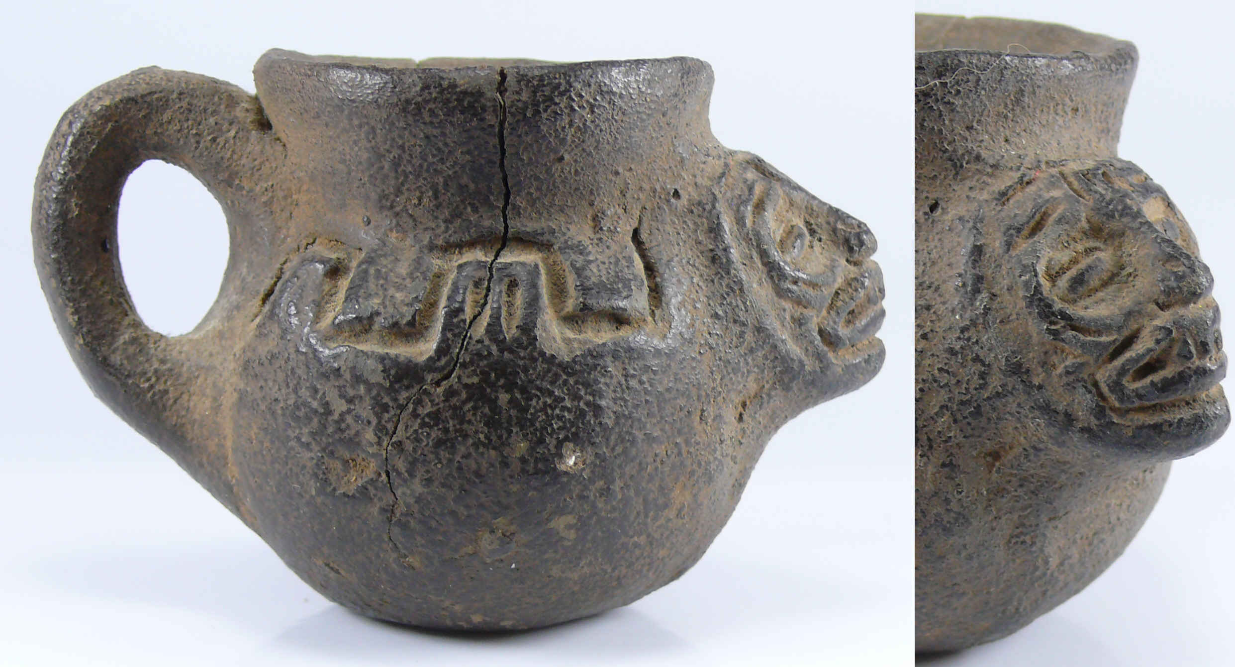 Avers : Vase antropomorphe à une anse orné d’une frise et d’un visage humain. 65 mm.