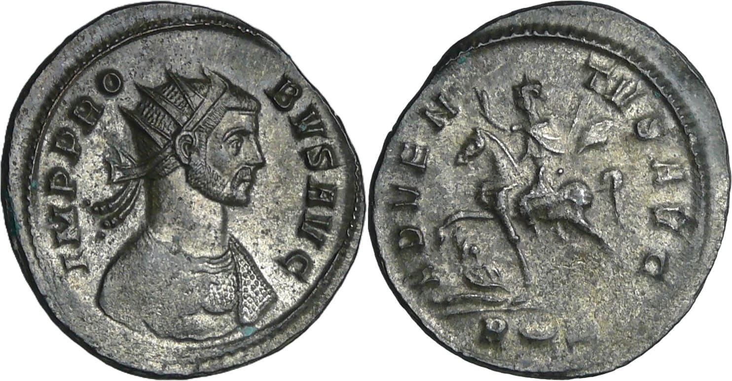 R/ ADVENTVS AVG // R(croissant)Z. Probus chevauchant à gauche, levant la main et tenant un sceptre. Sous les antérieurs du cheval, un captif.