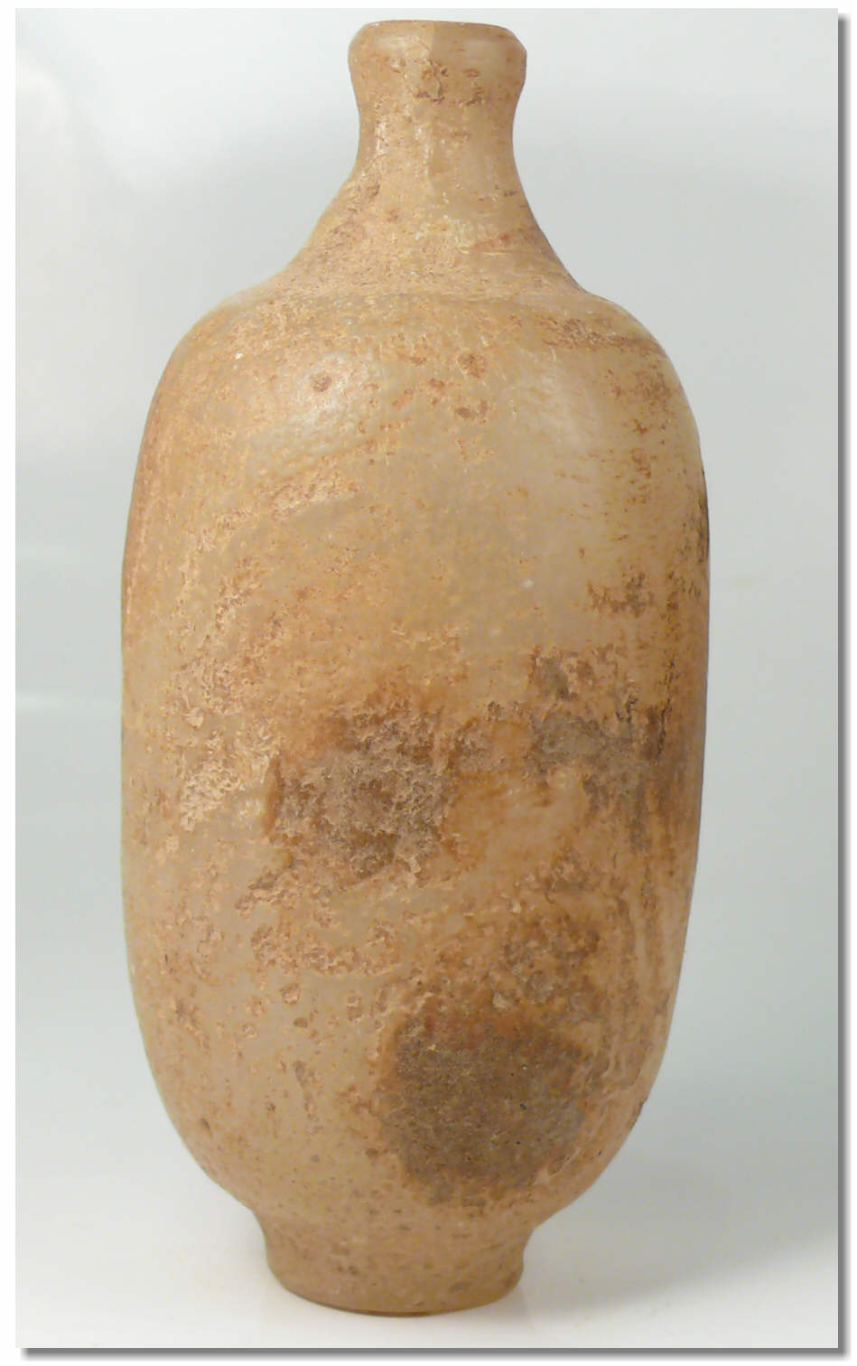 Avers : Importante bouteille à tronc conique en albâtre – Procédé de fabrication : ces objets étaient fabriqués en deux parties puis réunies par collage – 105 mm.