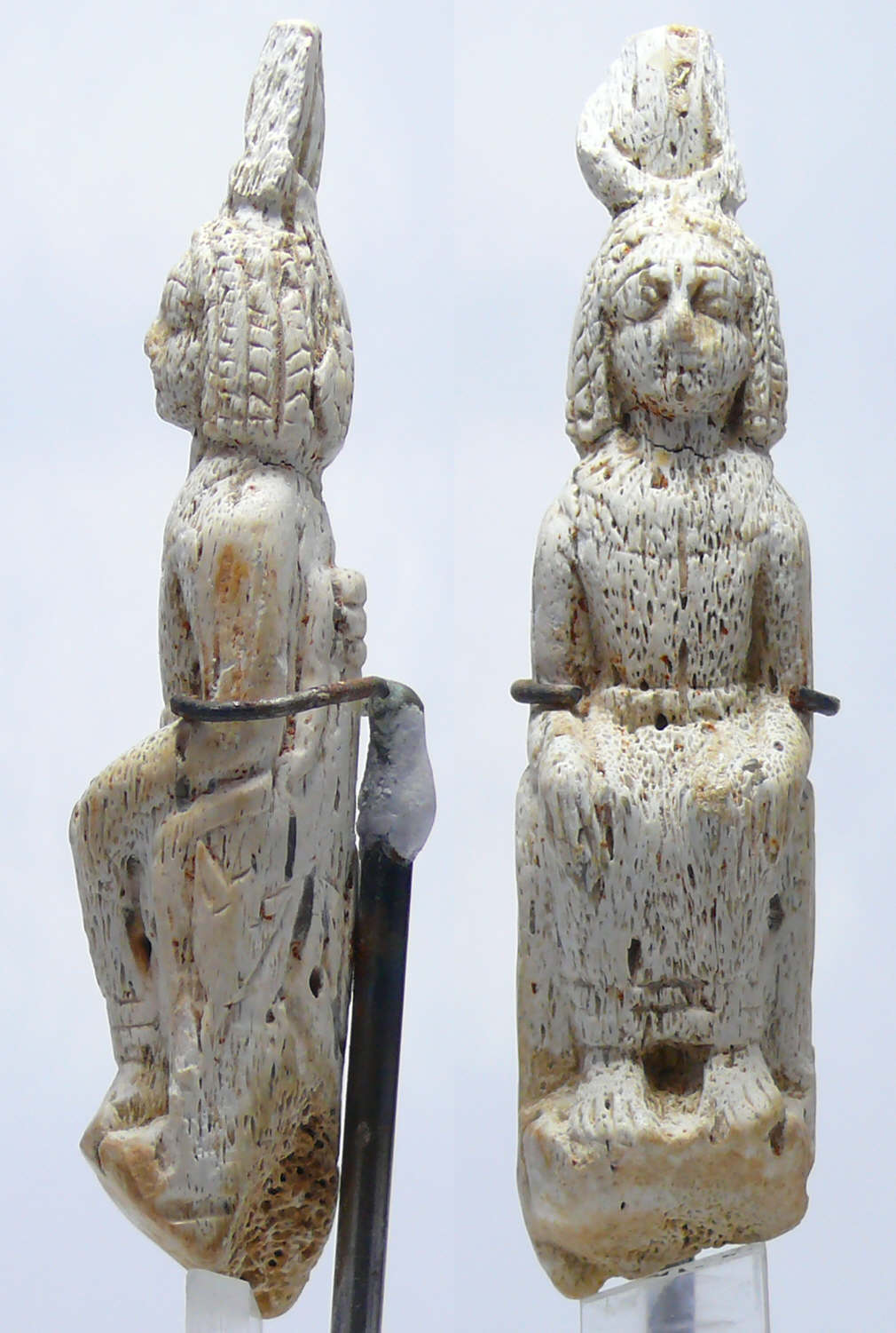 Avers : Idole figurative en os représentant Astarté-isis trônant. Magnifique sculpture. A noter un petit manque dans la coiffe et un recolage au niveau du cou. Dimensions : 95*25 mm.