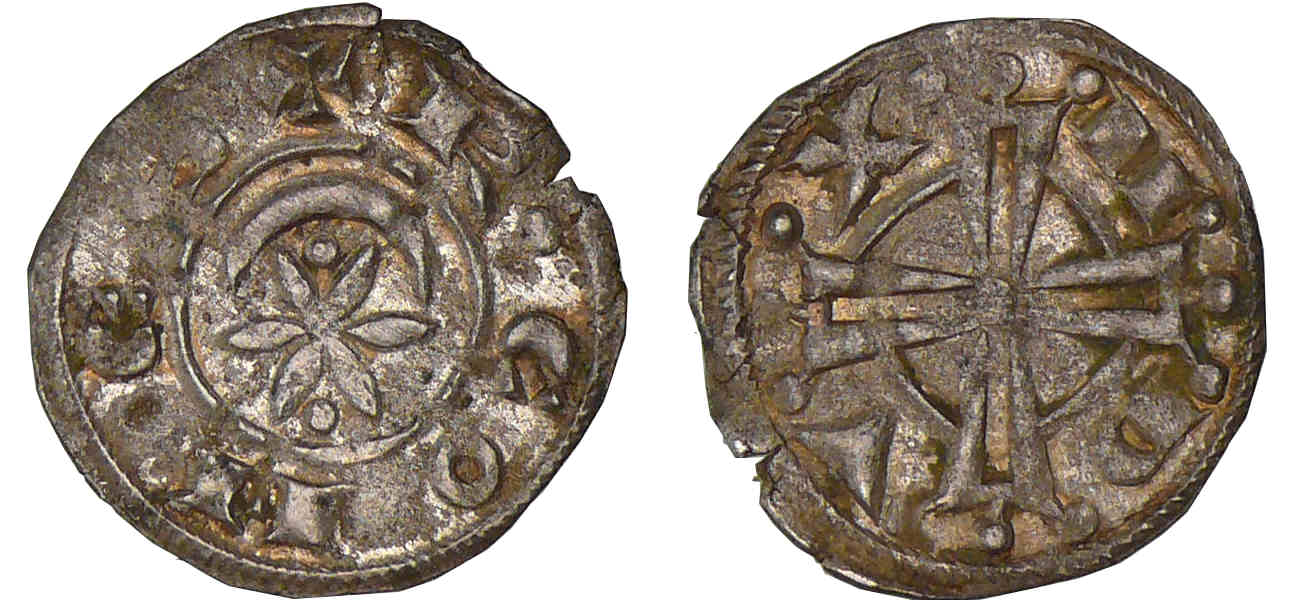Raymond VI (1148-1222). A/ + R° COMES. Soleil entre deux besants, au-dessous d’un croissant de lune.