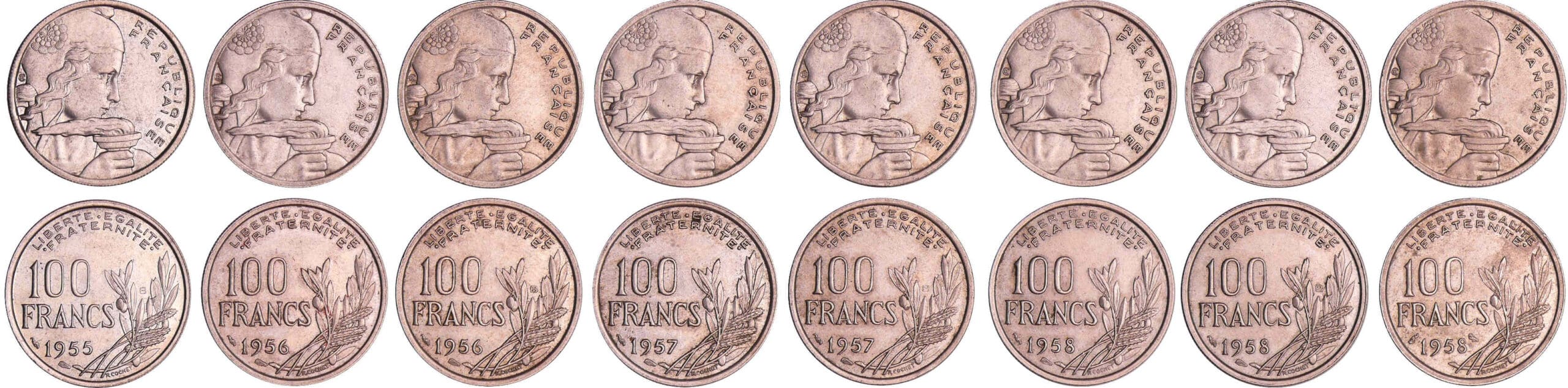 Quatrième république (1947-1959) – 100 francs Cochet, lot de 8 monnaies