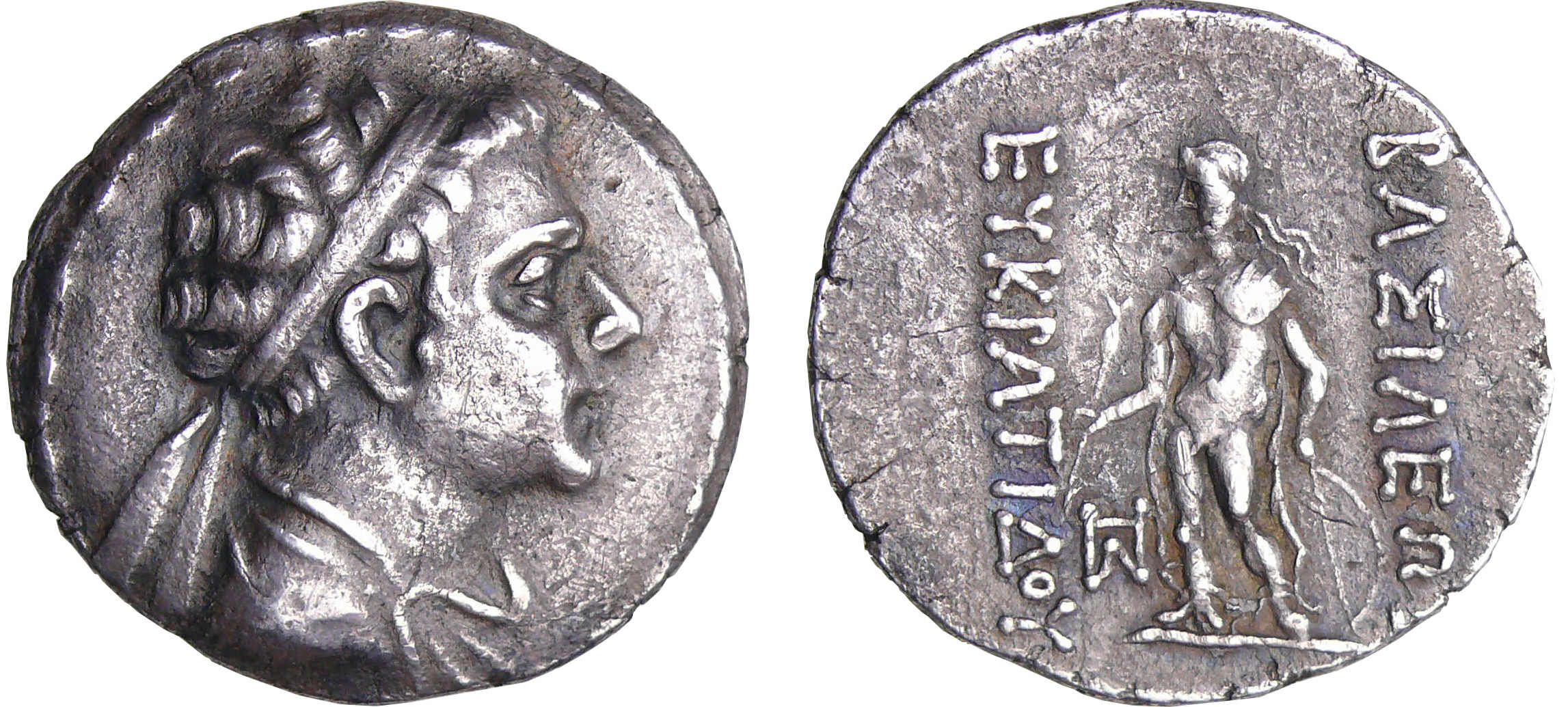 R/ ΒΑΣΙΛΕΩΣ / ΕΥΚPATIAΟΥ / KP en monogramme. Deux cavaliers à droite.