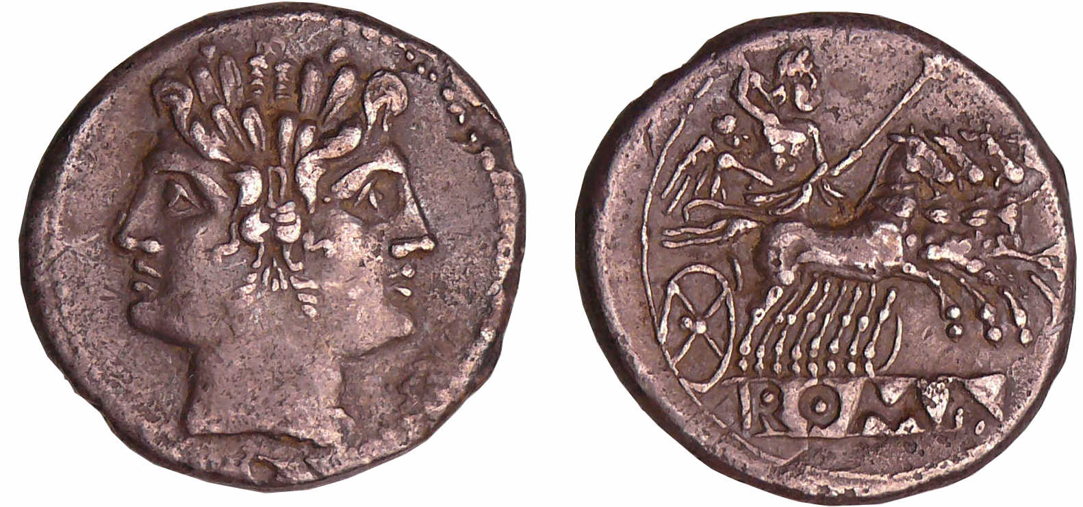 Avers : A/ Têtes imberbes janiformes des Dioscures, Castor et Pollux.