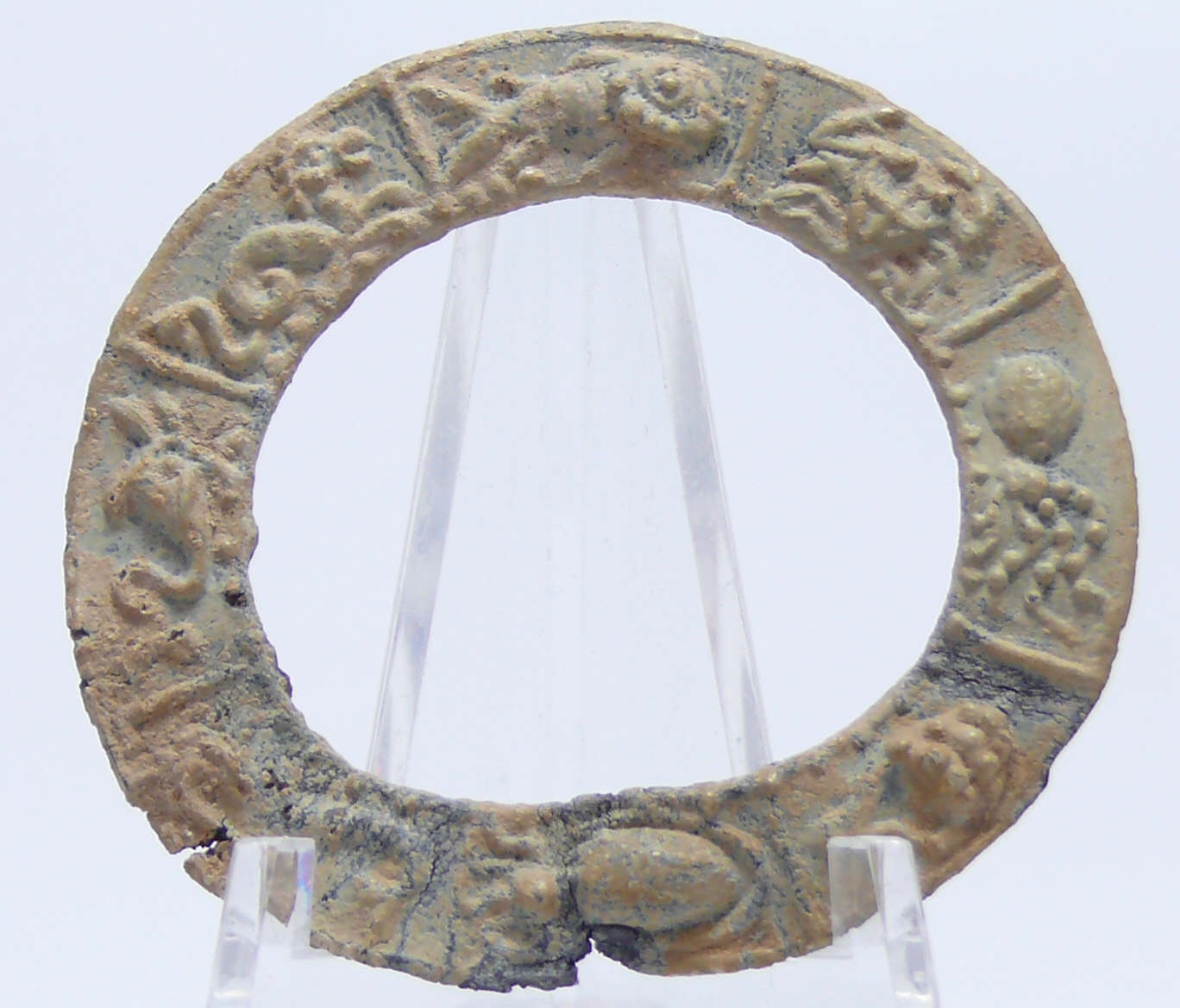 Avers : Rare anneau bordant un petit miroir. L’anneau est orné de représentations marines : poulpes, crabes, poissons, animaux fantastiques et coquillages. Dimension : 50 mm de diamètre.