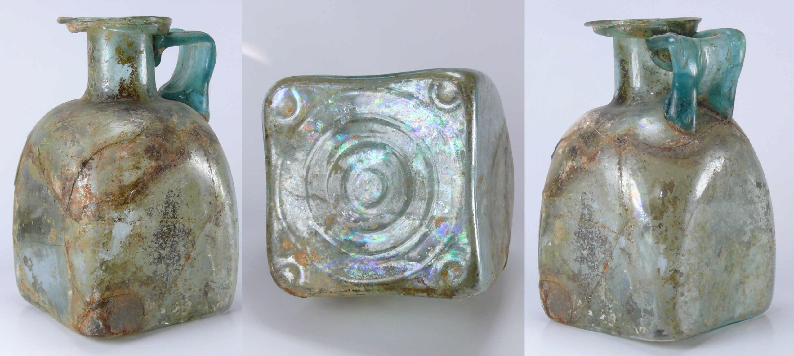 Rare bouteille carrée en verre irisé. Pas de manque mais des traces de restauration. 150x85x85 mm.