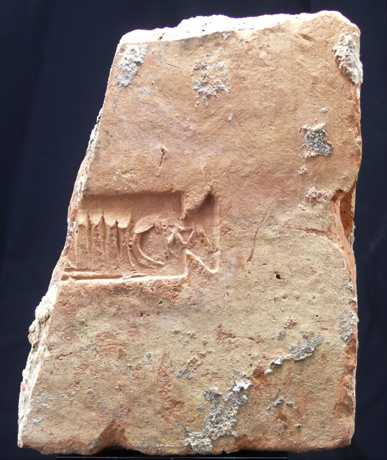 Avers : Brique de la Légion XIIII GMV = Gemina Martia Victrix (« jumelle victorieuse grâce à Mars »). Cette légion a d’abord stationné en Bretagne (Angleterre), puis à Mayence (Allemagne) et enfin, à partir du IIème siècle, à Carnuntum (Autriche). Dimensions : 140*120*50 mm.