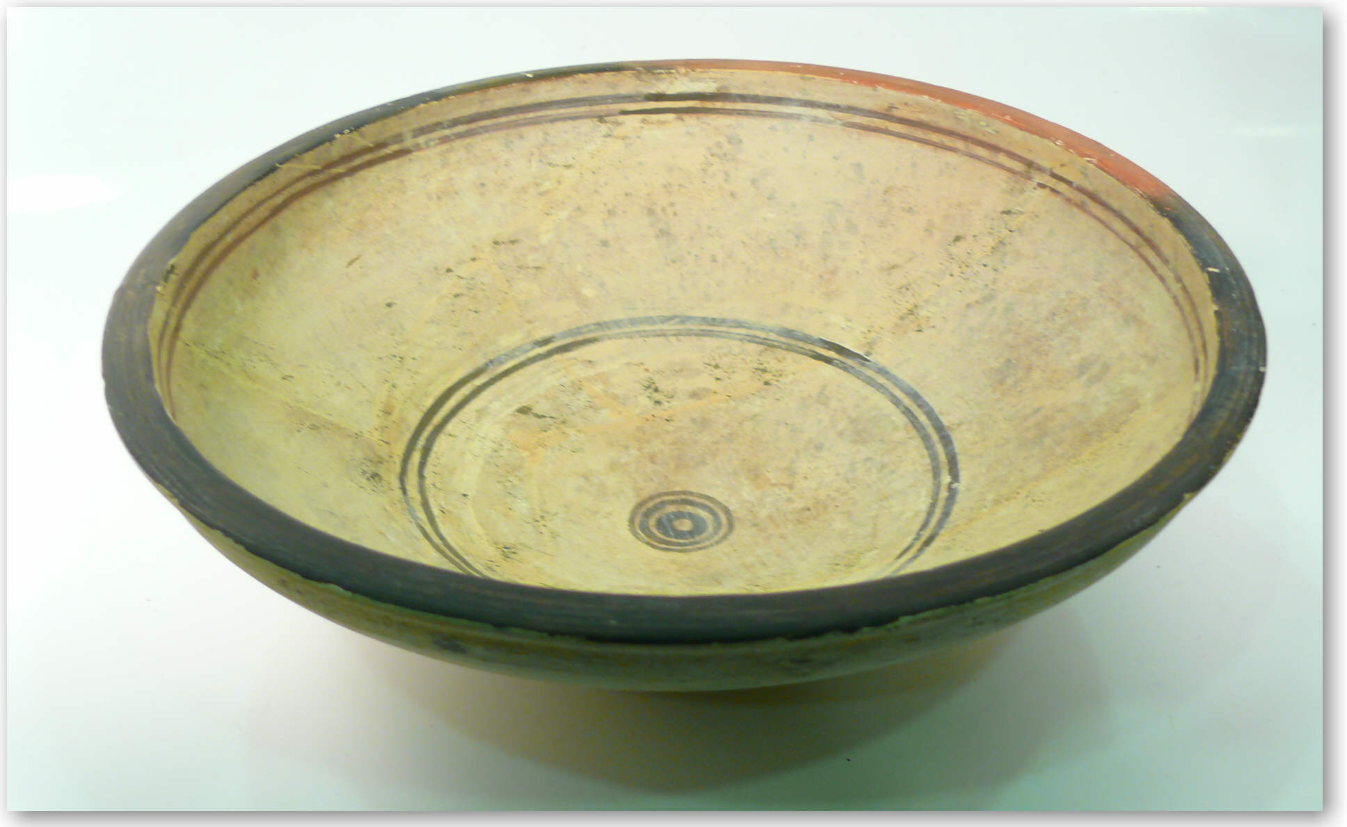 Avers : Large coupe en terre cuite de couleur beige, comportant de nombreuses traces de restauration. L’objet est décoré de cercles concentriques. Diamètre 200 mm, hauteur 70 mm.