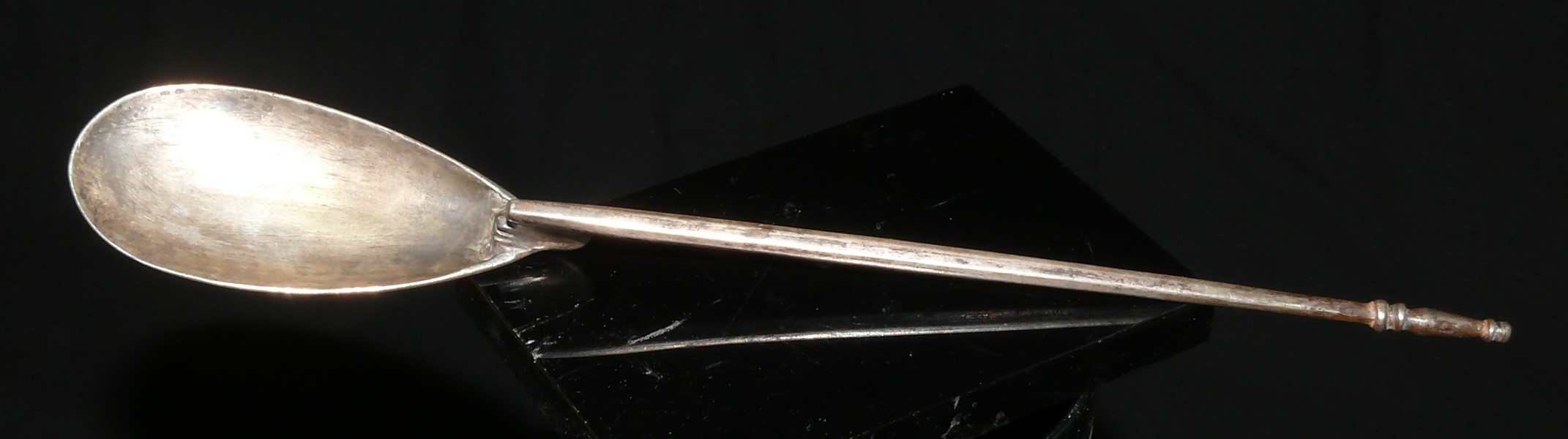 Avers : Grande cuillère complète en argent. Grand manche orné à son extrémité. Dimension : 230 mm.