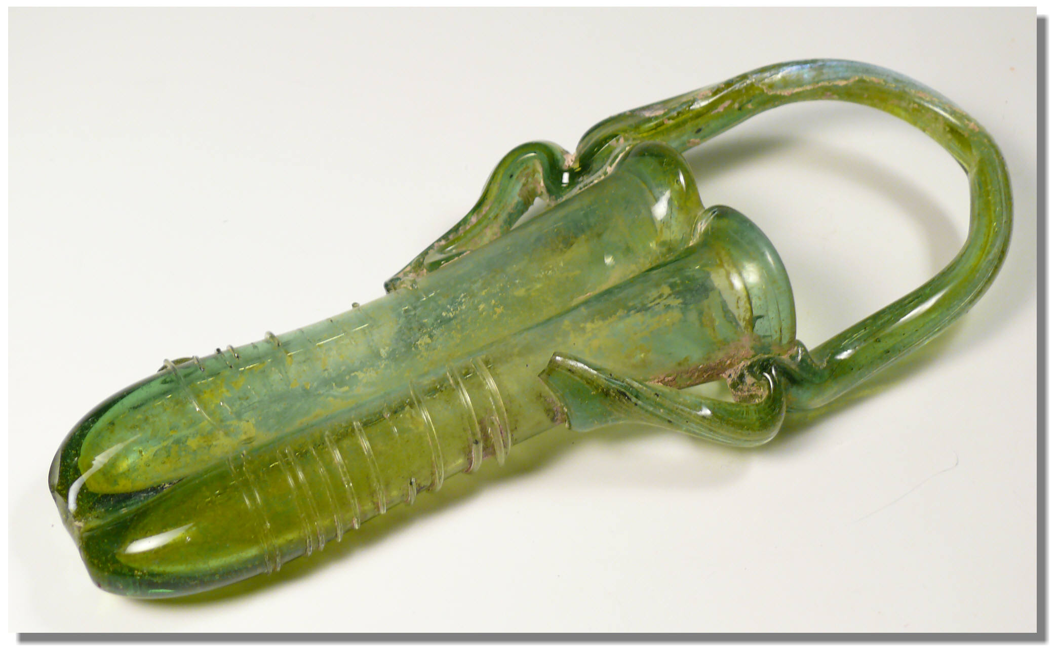 Très grand et beau double lacrymoire à anses de couleur verte – L’objet est décoré d’un fil de verre torsadé – 173×70 mm.