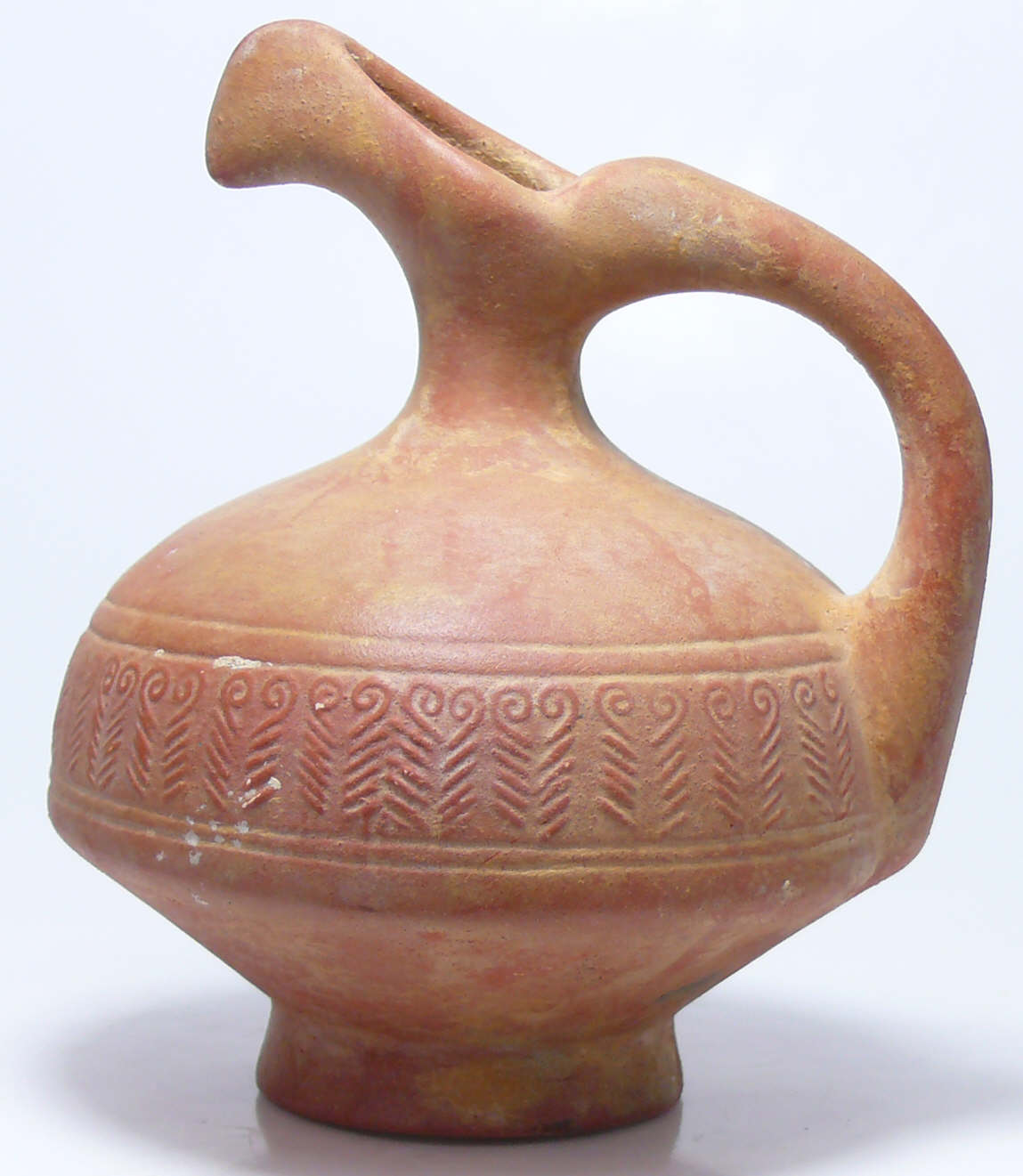 Grand oenochée en sigillée de couleur rouge pâle, orné d’une belle frise contituée de chevrons et volutes. Dimensions : 120*110 mm.