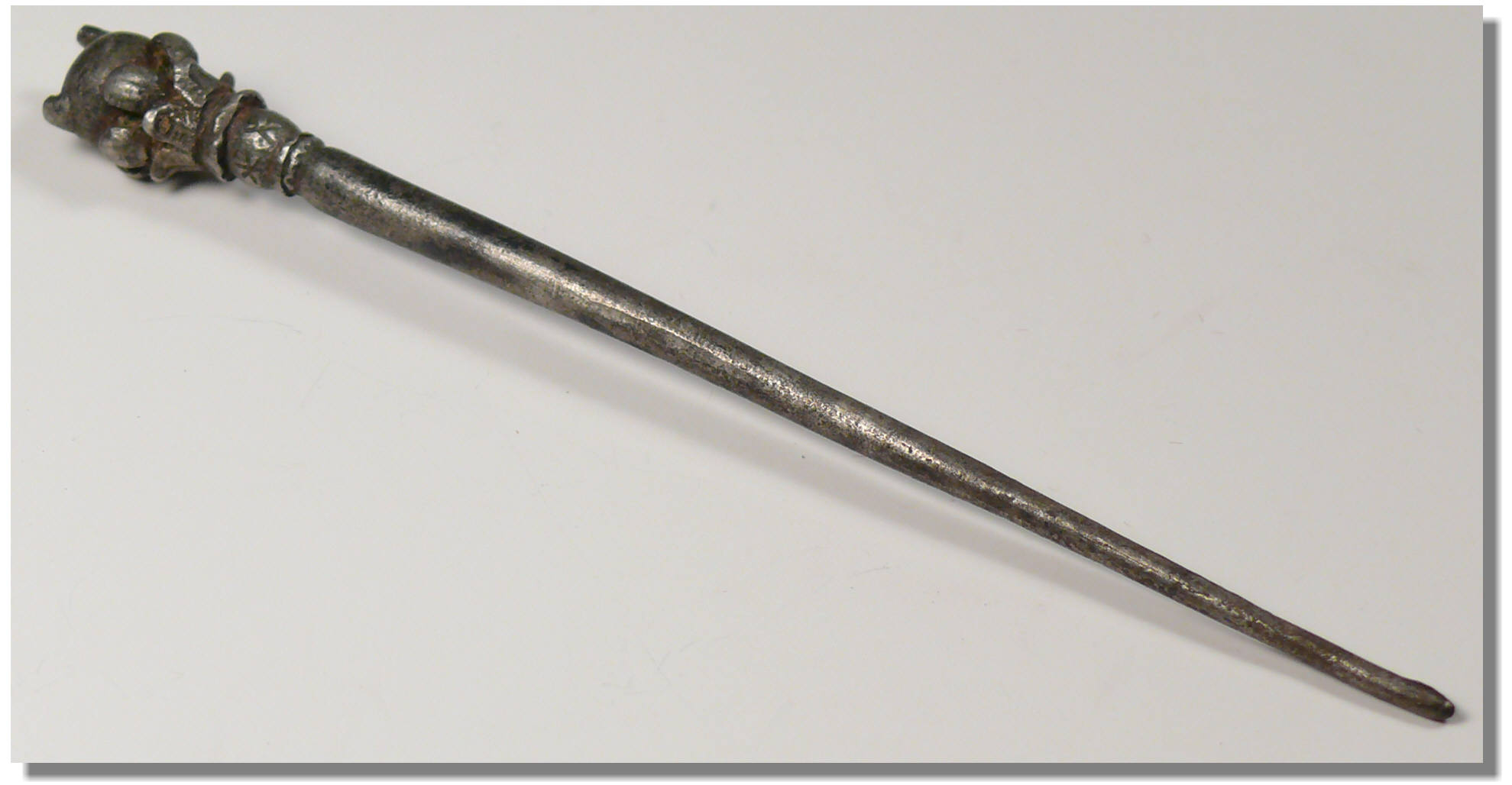 Grande épingle en argent massif, ornée en son extrémité d’une représentation florale – 98 mm.