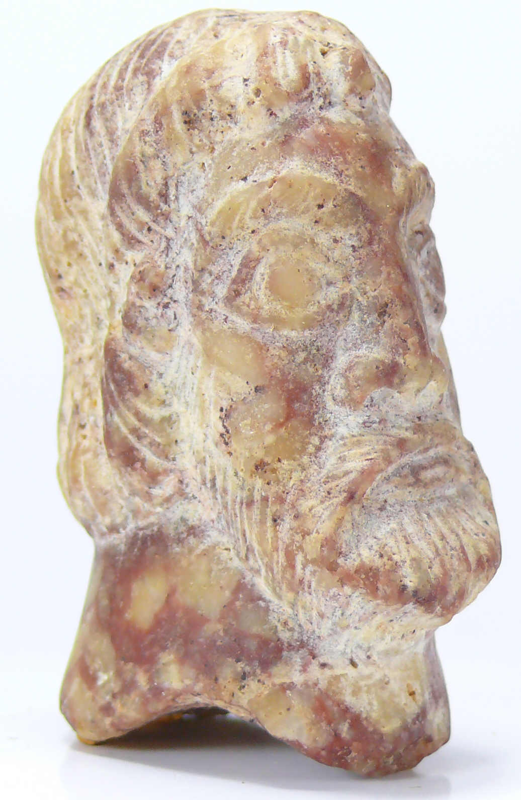Avers : Tête en pierre de couleur brune, probablement en marbre, représentant un homme barbu. 51 x 35 mm.