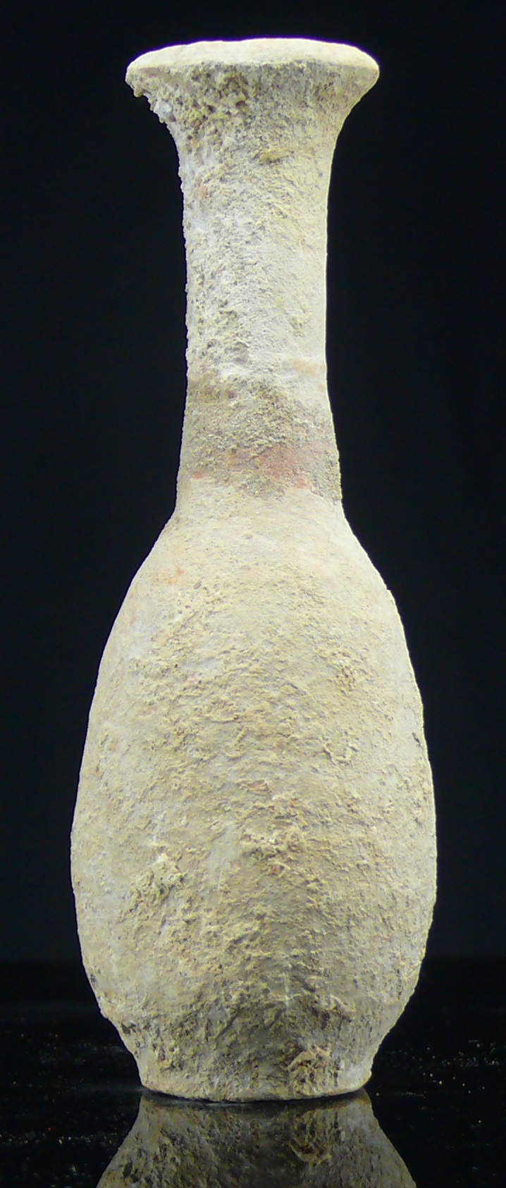 Belle fiole en terre cuite de couleur beige à panse allongée et col long à bord évasé. Trace de recollage au bas du col. 110*35 mm