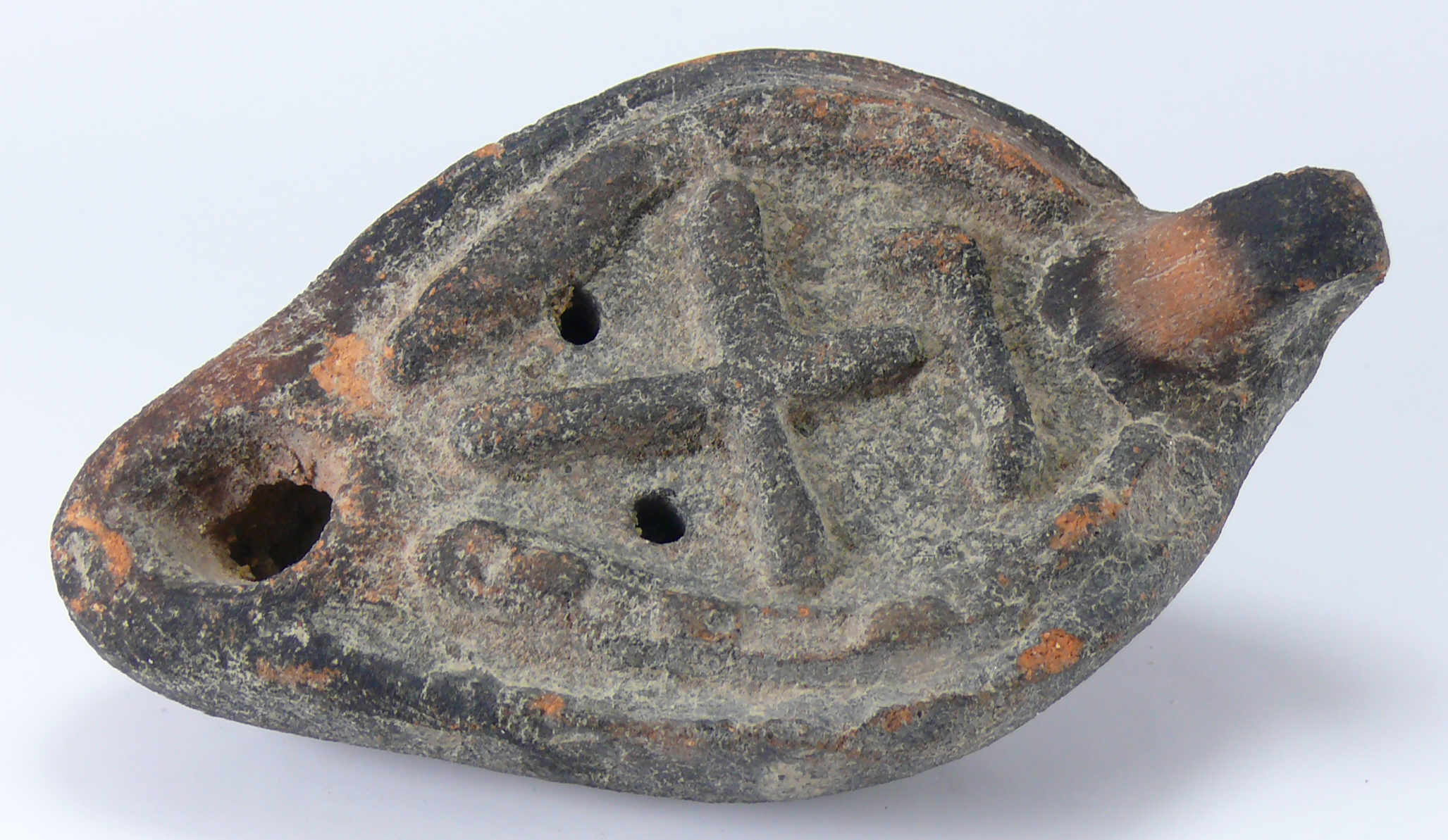 Avers : Lampe à huile en terre cuite de couleur noire ornée d’une croix en médaillon. 90 mm.