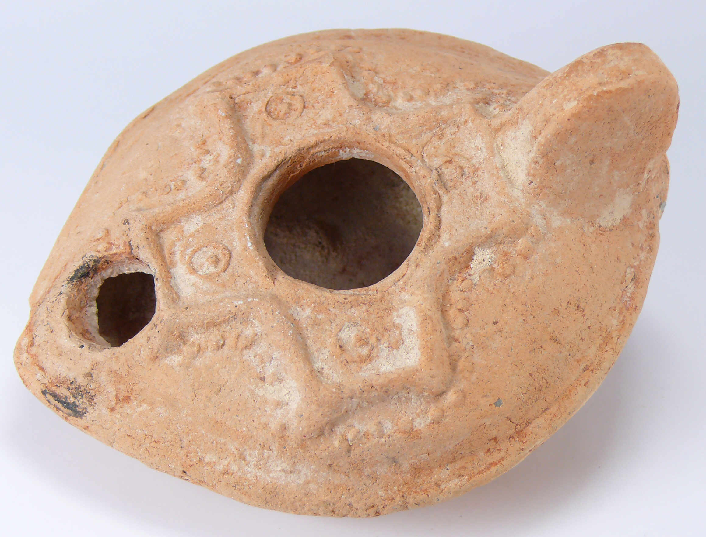Avers : Lampe à huile en terre cuite de couleur beige, ornée en médaillon d’une croix décorée d’oselles. 90 mm.