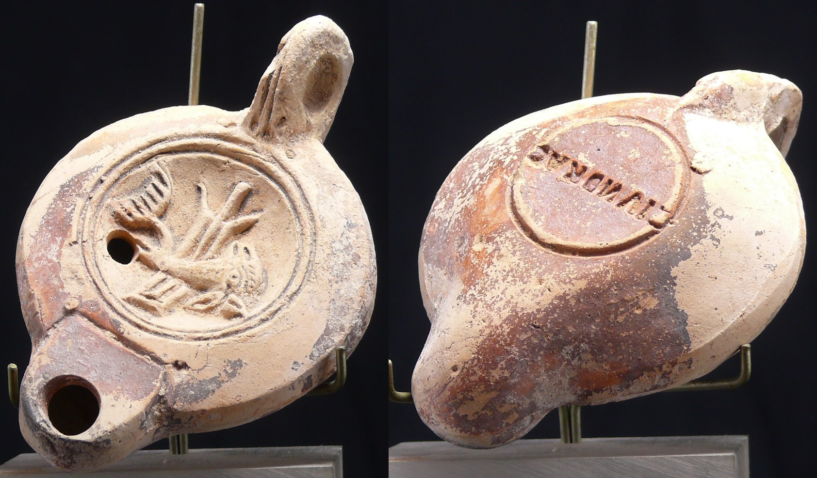 Avers : Lampe à huile en terre cuite de couleur beige avec les restes d’une engobe marron foncé. Un dauphin à droite en médaillon. La lampe est signée CIVNDRAS. Dimension : 105 mm de longueur.