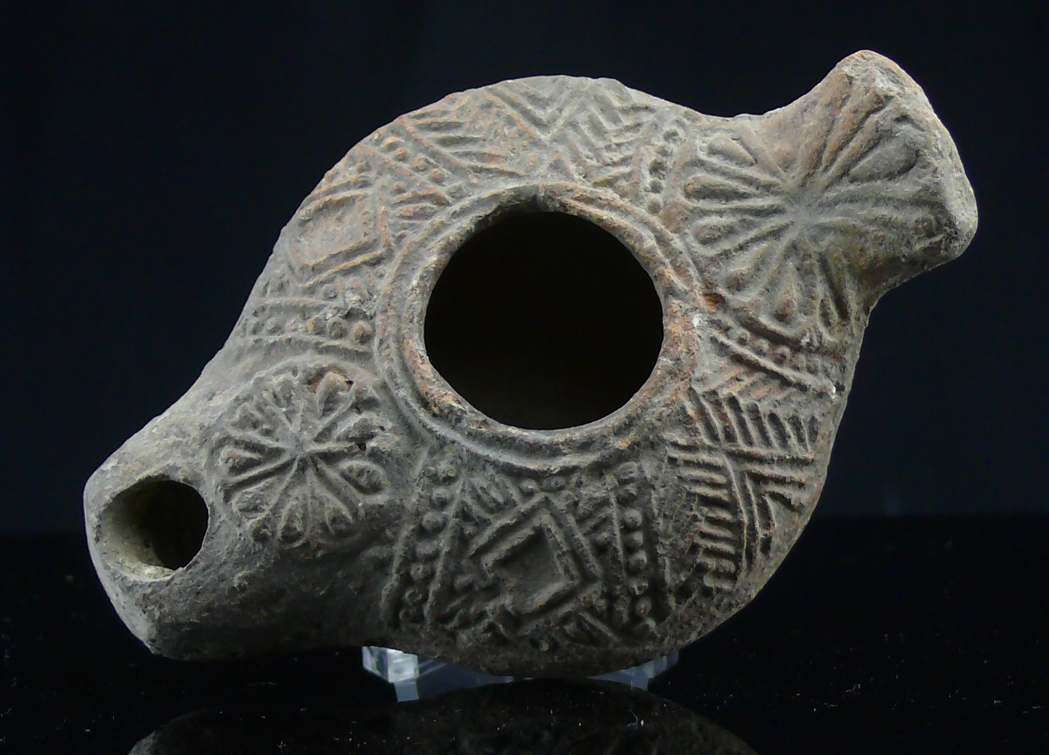Avers : Belle lampe en terre cuite de couleur grise, richement décorée de chevrons et losanges ; d’une fleur près du bec et une autre qui orne la poignée de préhension. 92*59 mm
