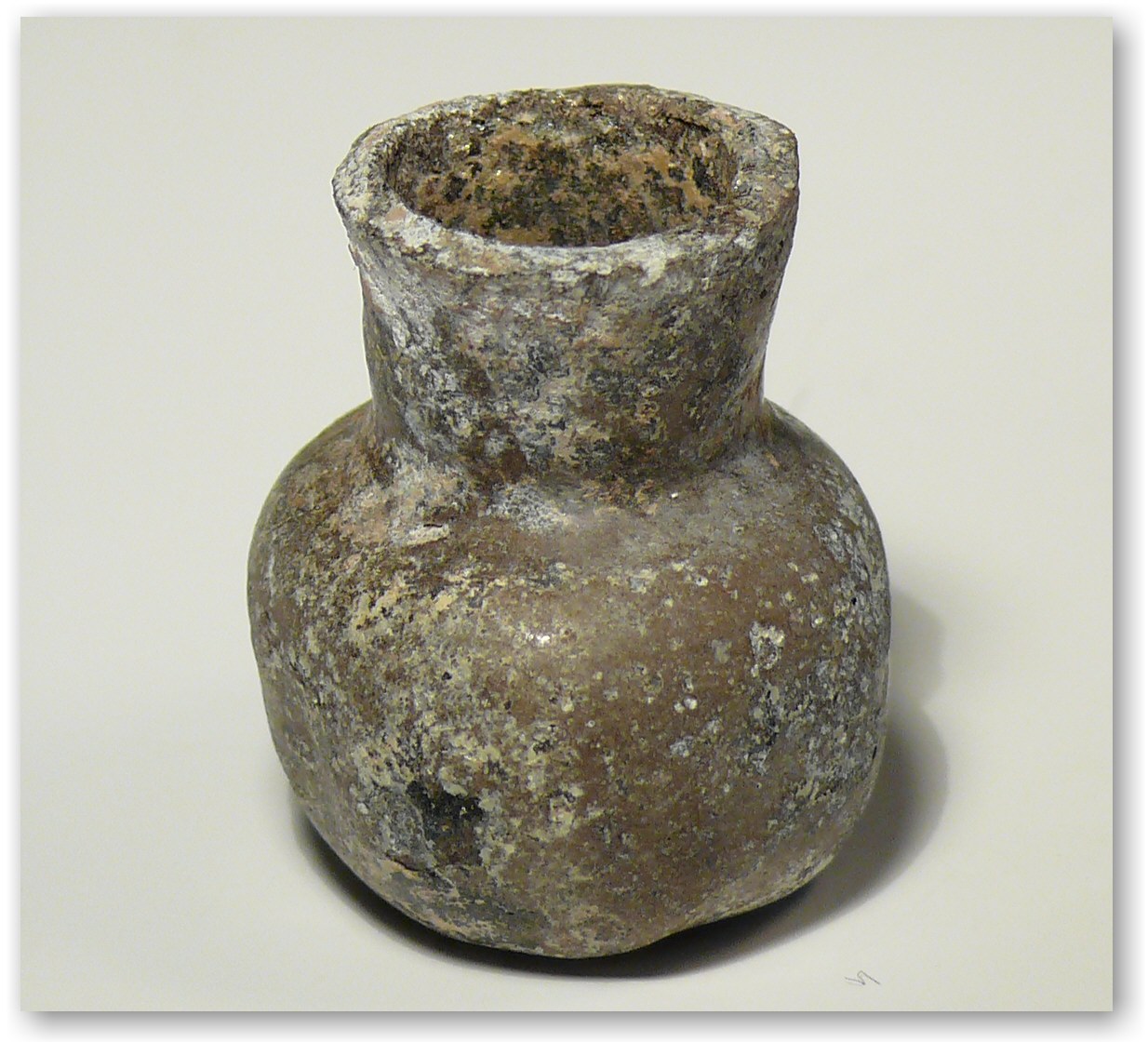 Petit vase à onguent en verre irisé aux reflets dorés – 28×26 mm.