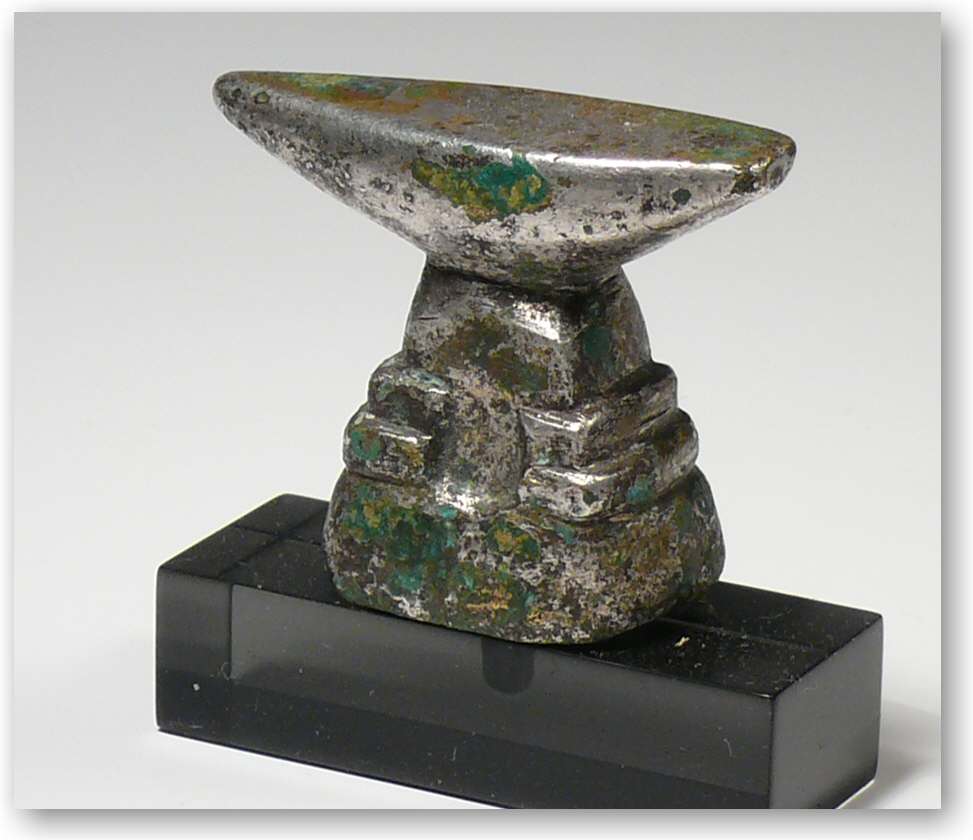 Très rare représentation d’une petite enclume de bronze recouverte d’argent – L’objet est probablement votif – 35×27 mm.