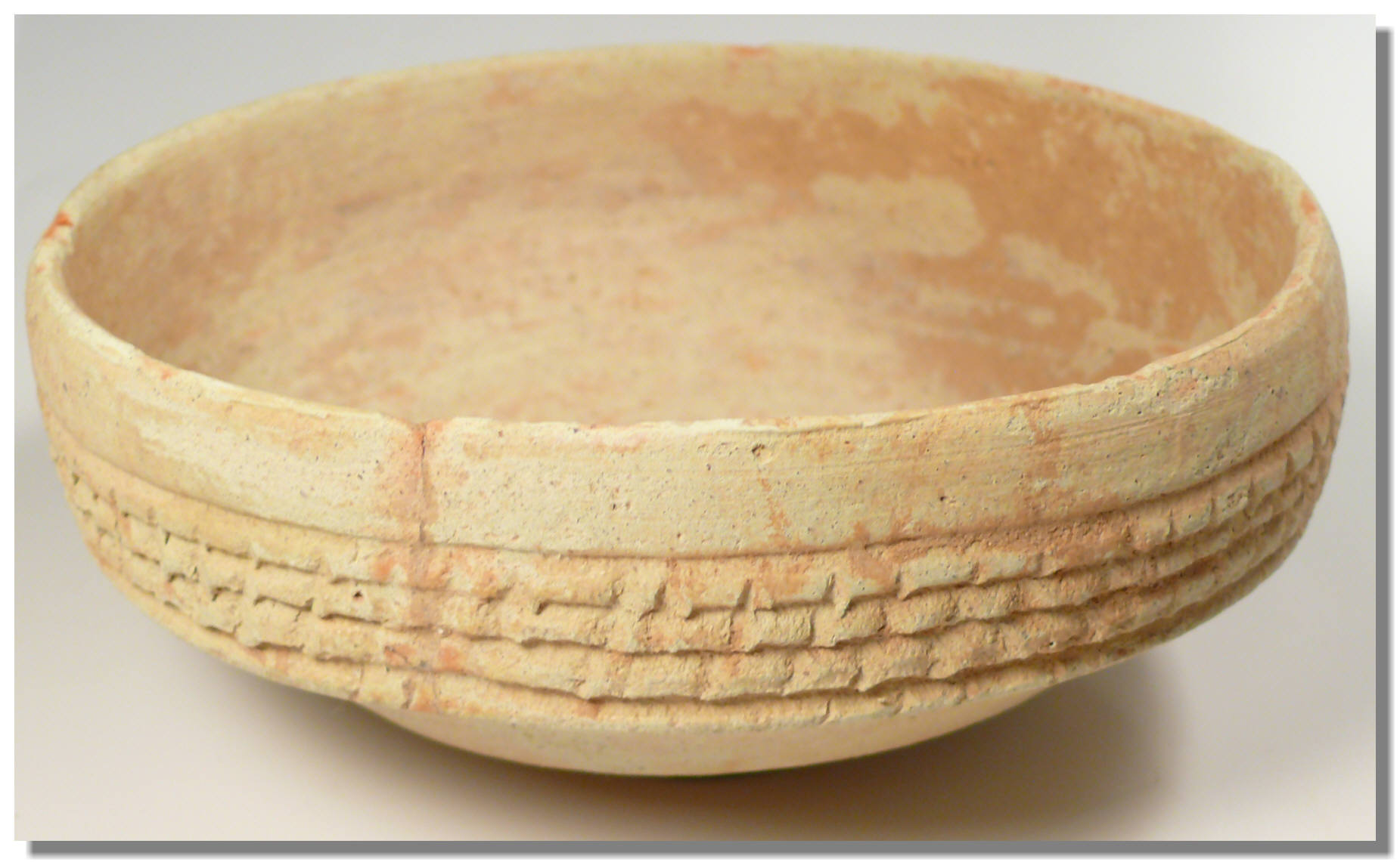 Plat en terre cuite comportant quelques traces de restauration – L’objet est orné de trois lignes géométriques ciselées – 165×68 mm.