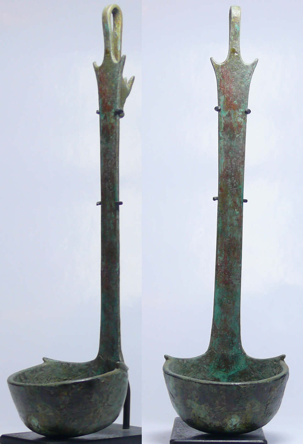Simpulum en bronze ( louche romaine) orné d’une tête de cheval. L’objet est recouvert d’une magnifique patine vert olive. Restauration au bas du manche. Dimensions : 230*70 mm.