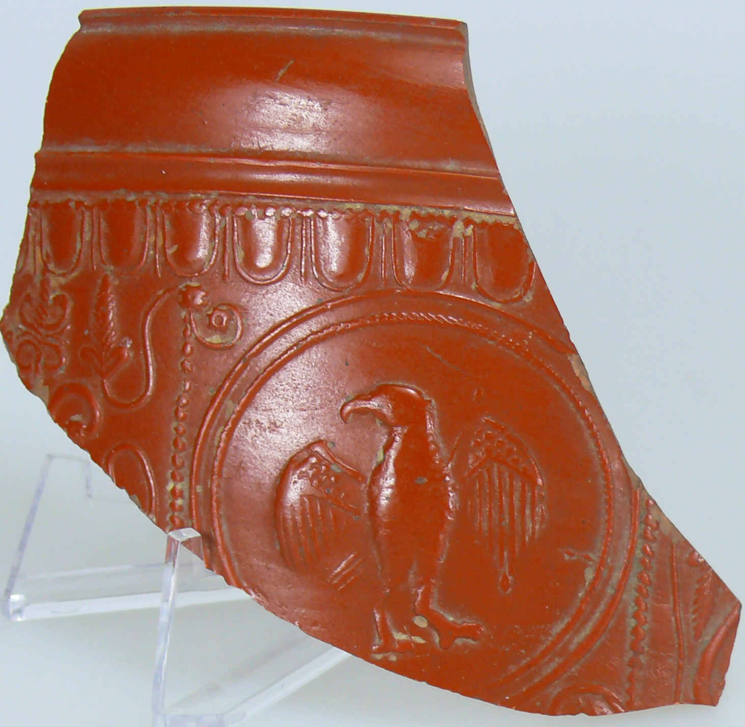 Avers : Important fragment de sigillée représentant l’aigle impérial. Trouvé en France dans la région d’Amiens, rue Dumeril. Dimentions : 90×77 mm.
