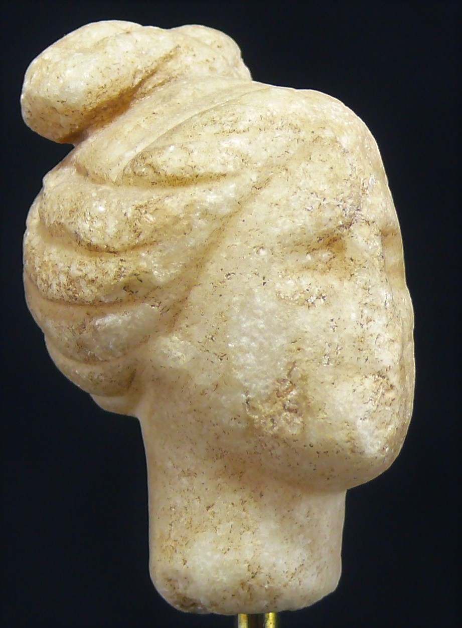 Avers : Jolie et fine tête en marbre blanc représentant un visage féminin joliment coiffé. Dimension : 55 mm.