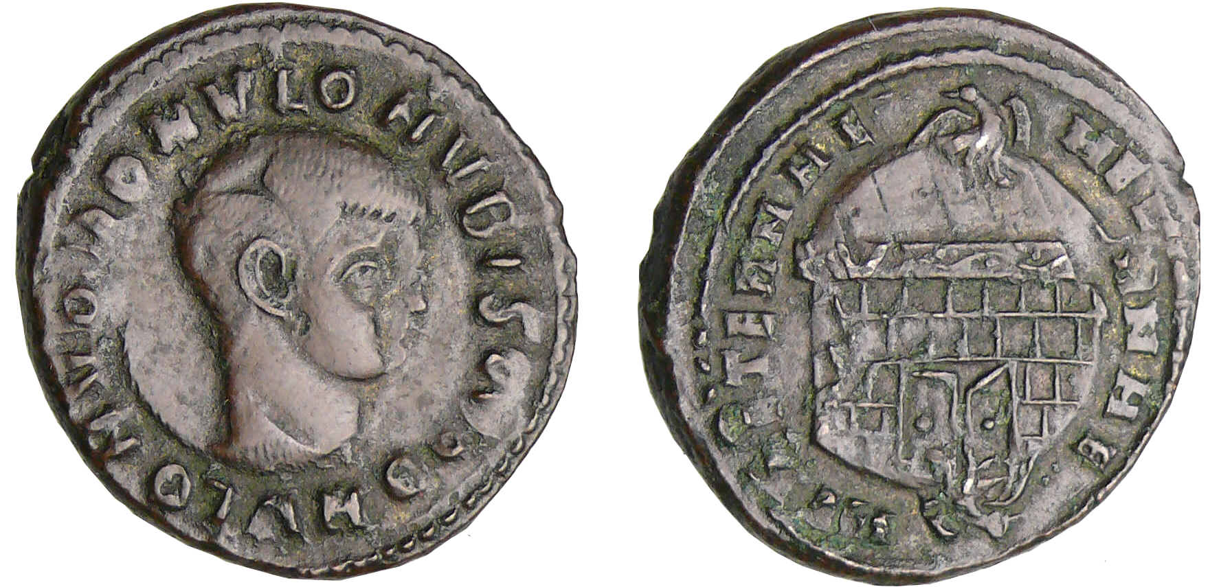 A/ IMP MAXENTIVS DIVO ROMVLO NV FILIO. Buste nu à droite.