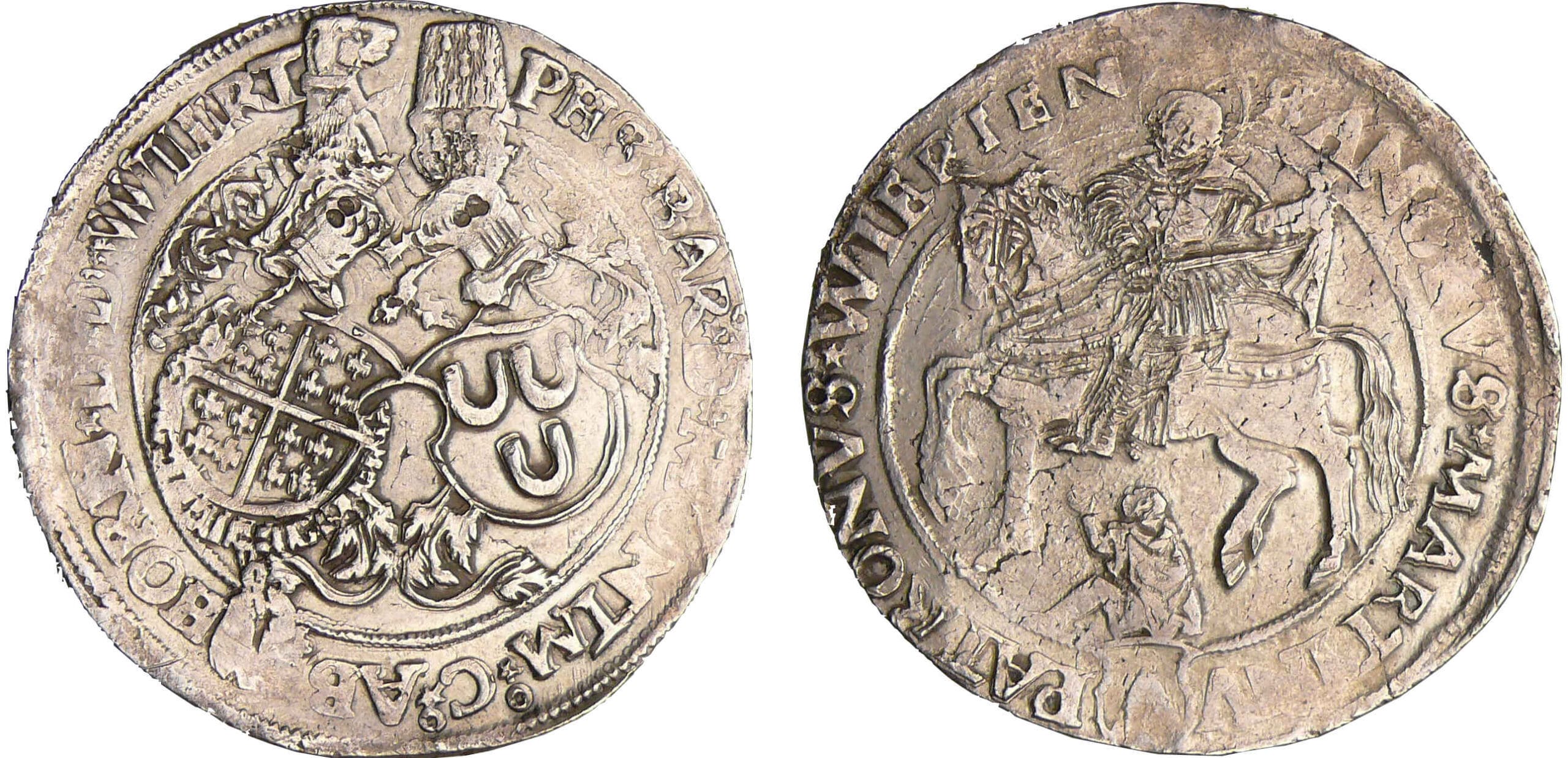 R/ SANTVS MARTINV PATRONVS WIERTEN St Martin à cheval, en dessous un mendiant.