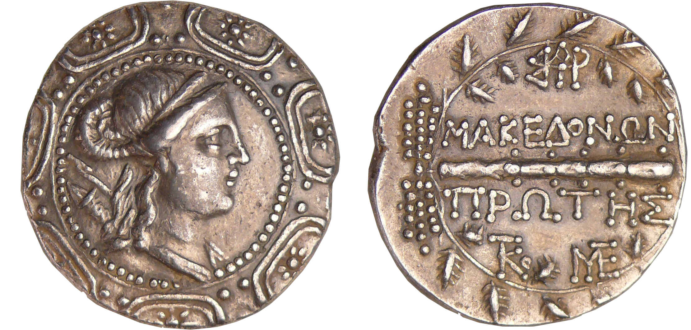 R/ MAKEΔΟΝΩΝ / ΠΡΩΤΗΣ, une massue de part et d’autre, le tout dans une couronne de chêne fermée par un foudre.