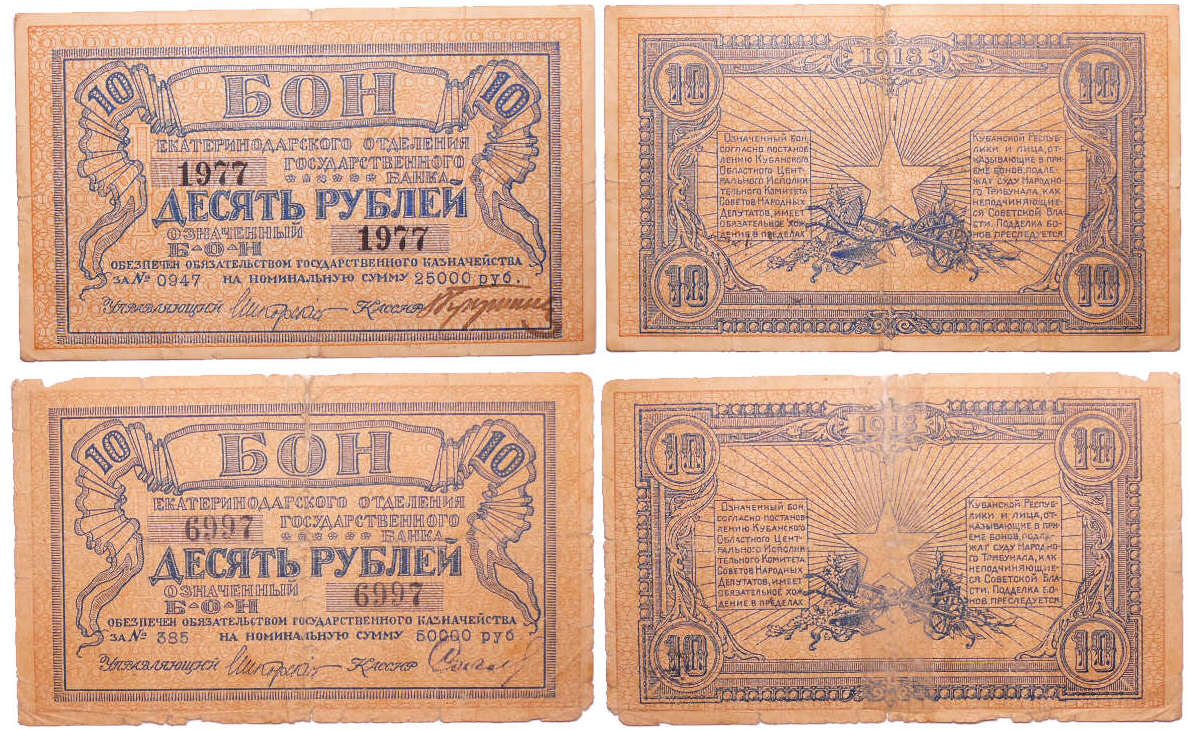 Russie – North Caucasus, Government bank, Ekaterindar – Lot de 2 billets de 10 roubles (1918)