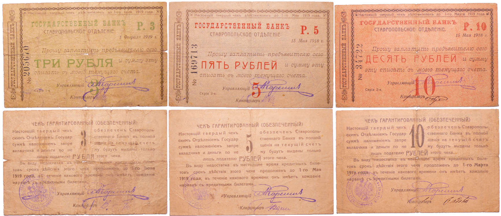 Russie – North Caucasus, Stavropol – Lot de 3 billets, 3 roubles (1919), 5 roubles, 10 roubles (1920)