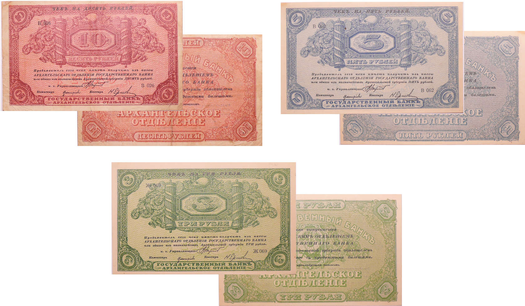 Russie – North Russia, Red regime – Lot de 3 billets 3, 5 et 10 roubles (1918)