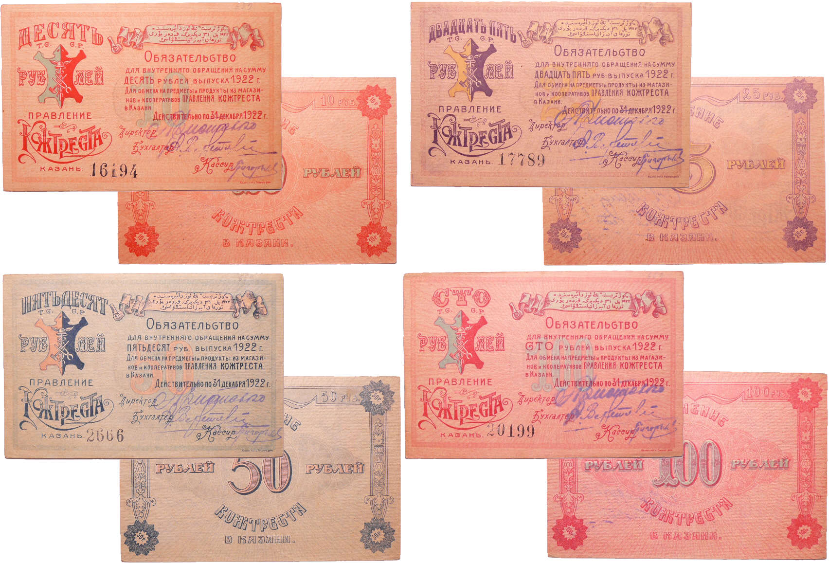 Russie – Orientale, Kazan – Lot de 4 billets, 10 roubles, 25 roubles, 50 roubles, 100 roubles (1922)