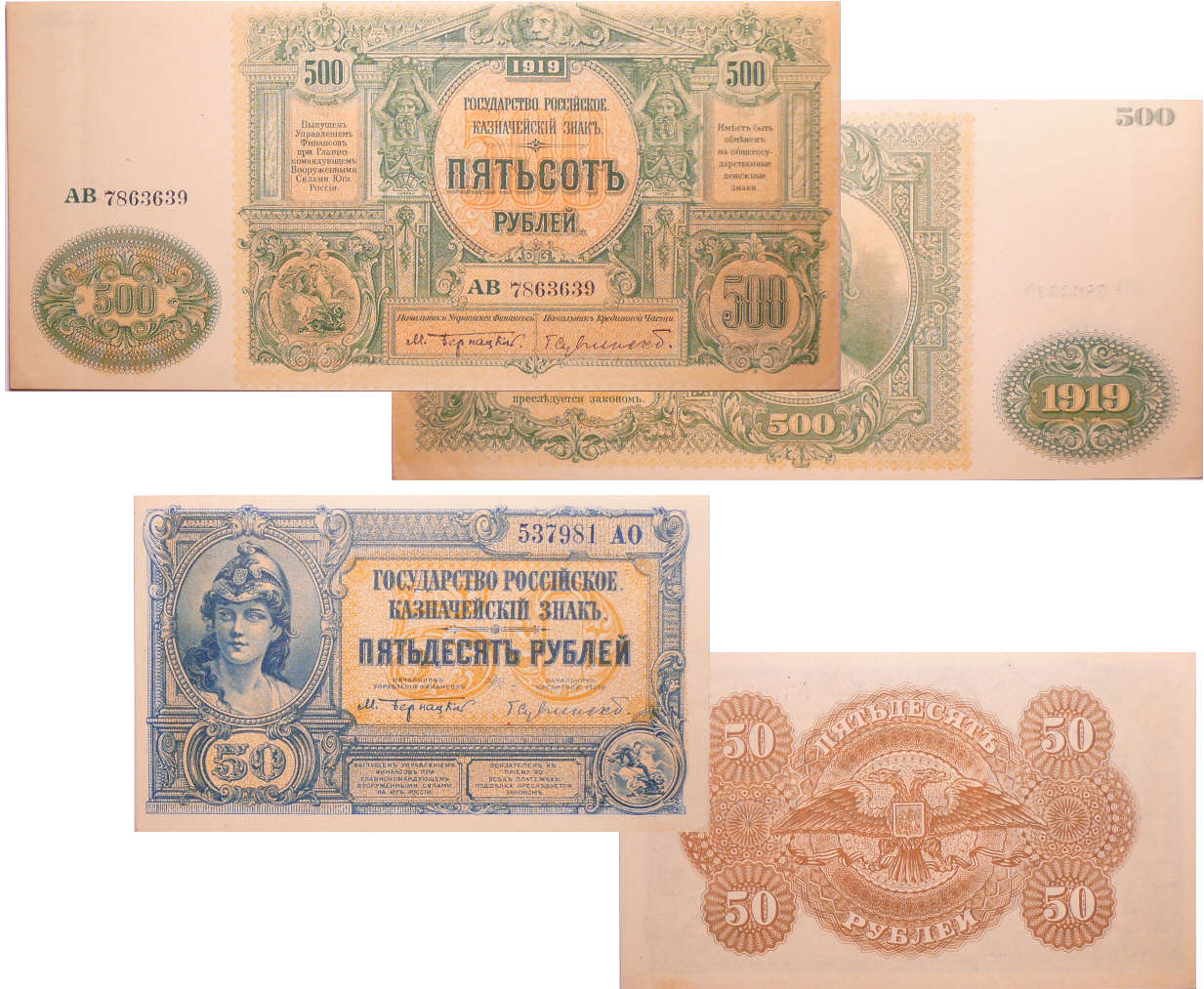 Russie – South Russia, Government treasury – Lot de 2 billets, 50 roubles, 500 roubles (1920)