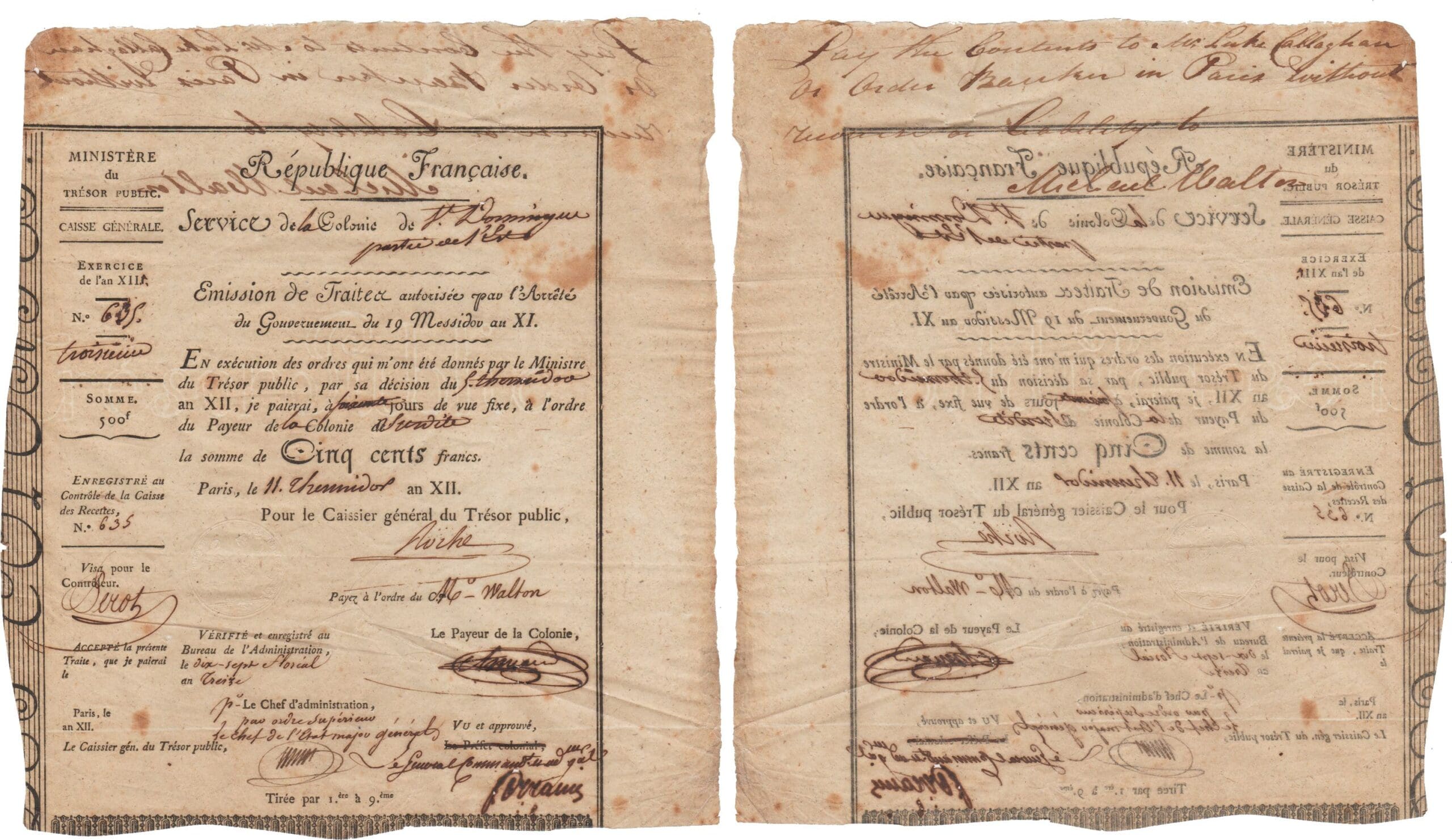 Saint-Domingue – Emission de traite pour la somme de 500 francs – Vérifié le 17 florial de l’an 13 (7 mai 1805)