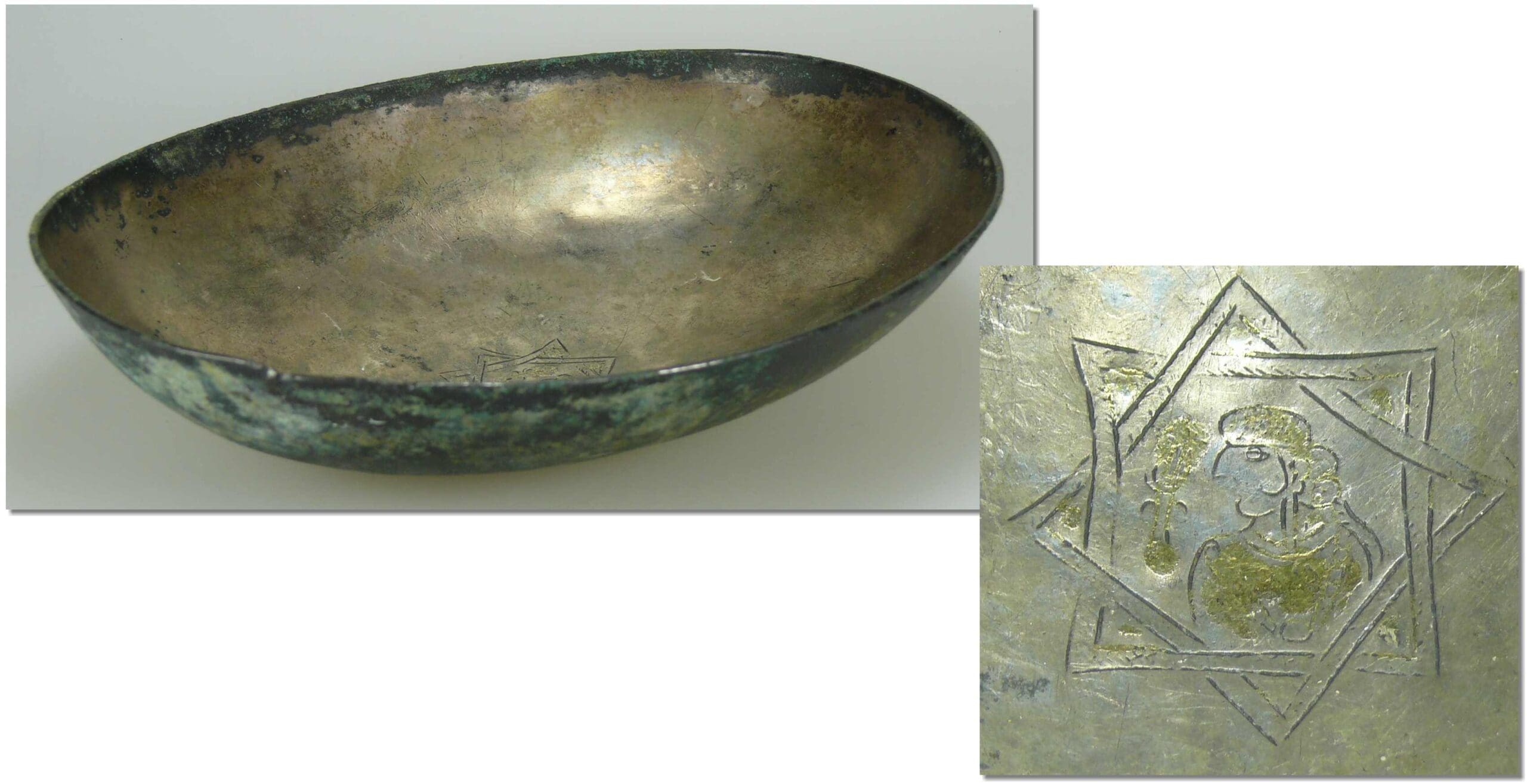 Avers : Grande coupe en argent de forme navicelle. L’objet est gravé en son centre d’un buste de femme à gauche dans une étoile formée de 2 carrés. 170×130 mm.