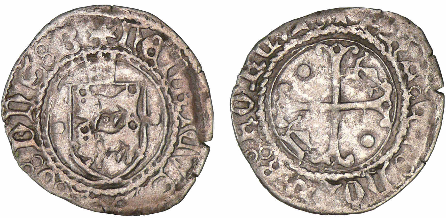 R/ + PAX: ET : HONOR: FORQVIE: Croix fourchée, cantonnée de deux H et de deux besants.