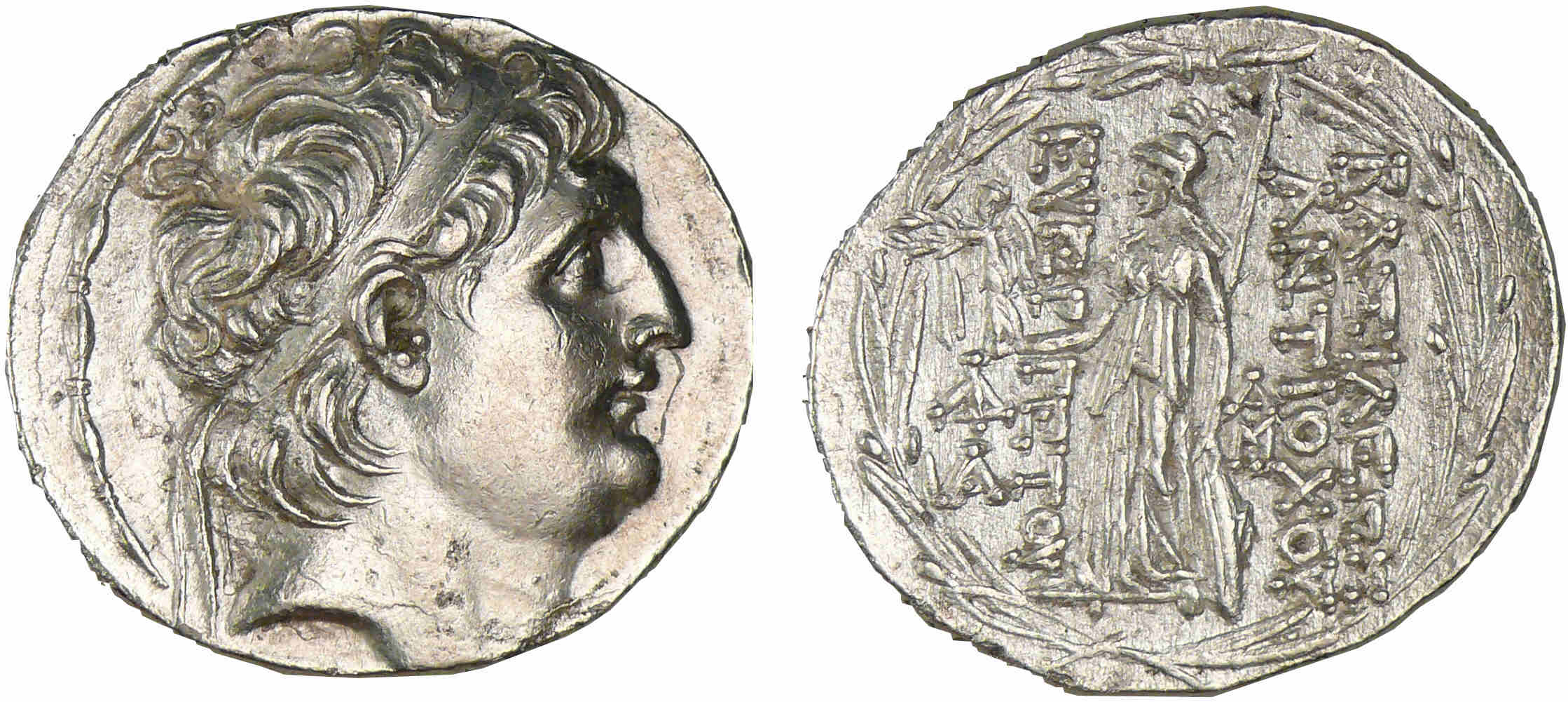 R/ ΒΑΣΙΛΕΩΣ / ΑΝΤΙΟXΟΥ / ΕΥΕΡΓΕΤΟΥ deux monogrammes. Athéna à gauche, tenant une Victoire.
