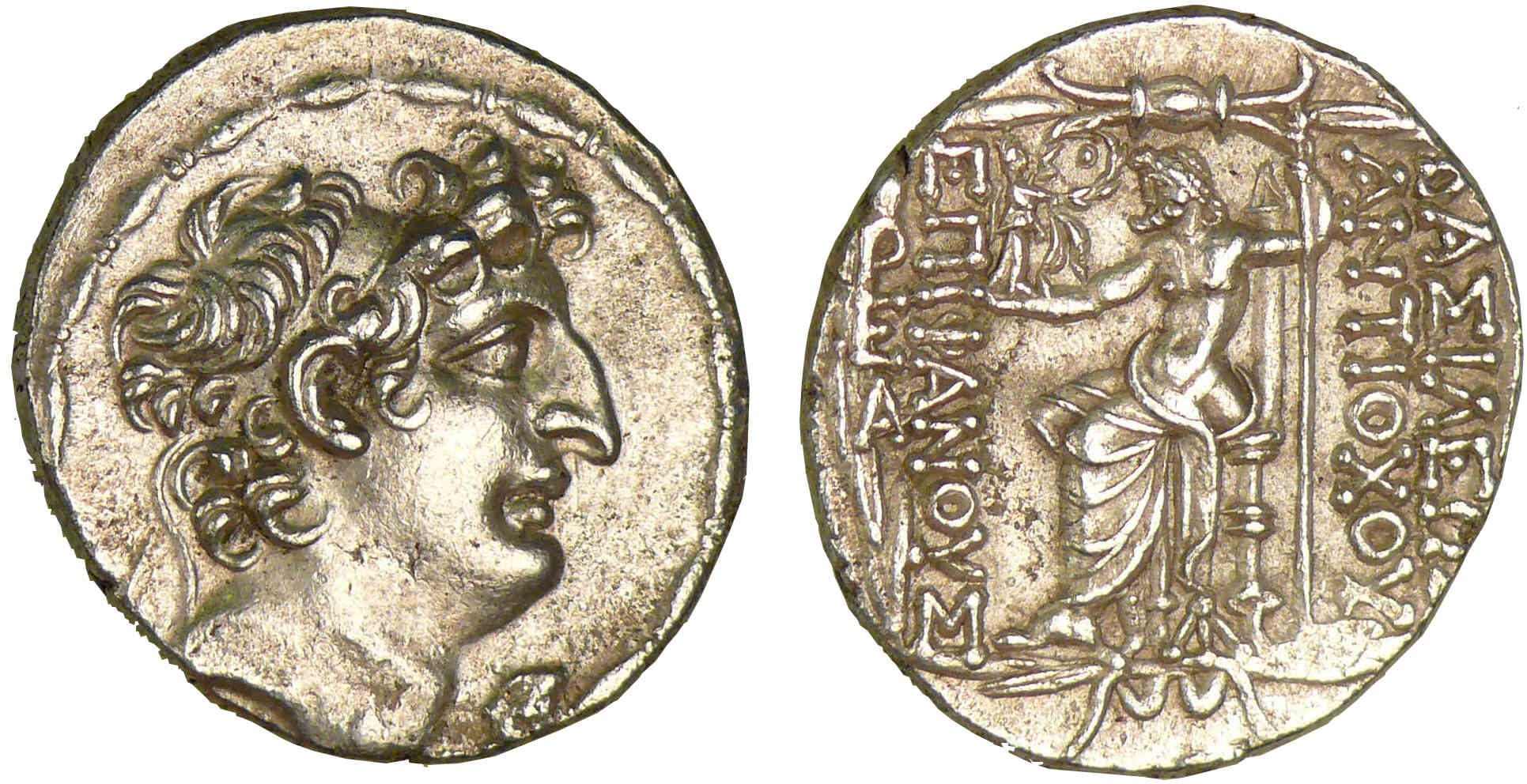 R/ ΒΑΣΙΛΕΩΣ // ΑΝΤΙΟΧΟΥ // ΕΠΙ-ΦΑΝΟΥΣ / ΑΡ // ΑΝ. Zeus Uranios assis à gauche, la tête surmontée d’un croissant.