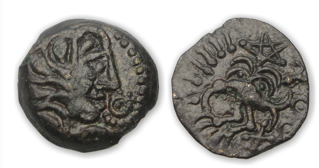 Avers : A/ Anépigraphe. Tête à droite, mèches de cheveux bouclées en arrière, nez long et pointu, devant la bouche un cercle lisse pointé entouré de perles, un torque sous le menton.