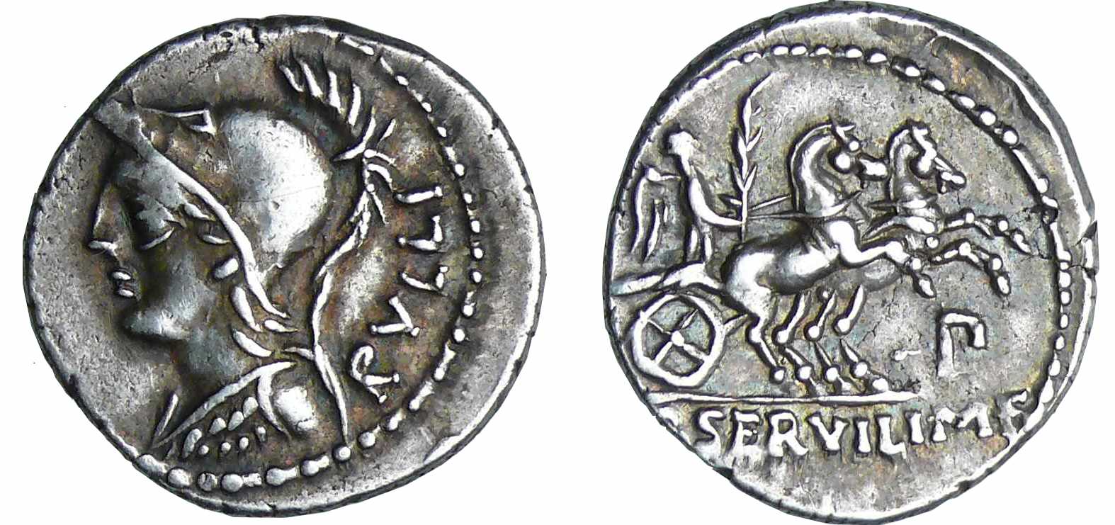 R/ P/ P. SERVILI.M.F. La Victoire dans un bige au pas à droite. Elle tient une palme de la main gauche et les rênes de la main droite. P sous les chevaux.