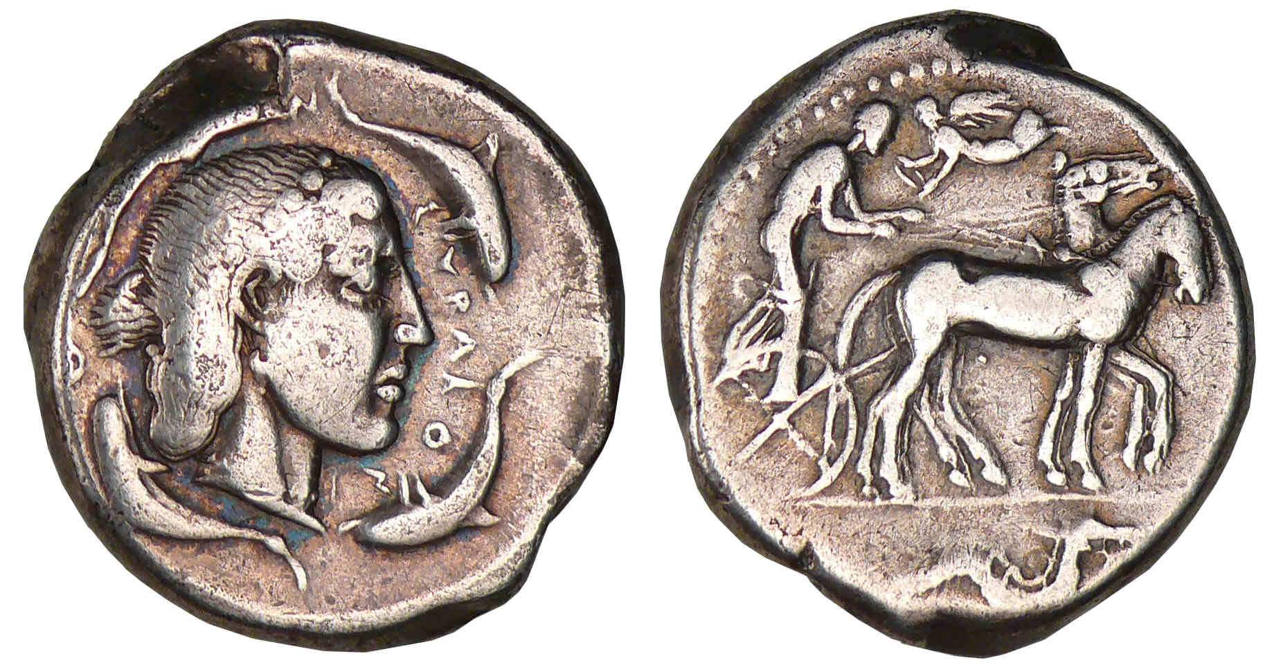 A/ ΣΥΡΑΚΟΣΙΟΝ. Tête d’Aréthuse à droite, coiffée d’un bandeau, entourée de quatre dauphins.