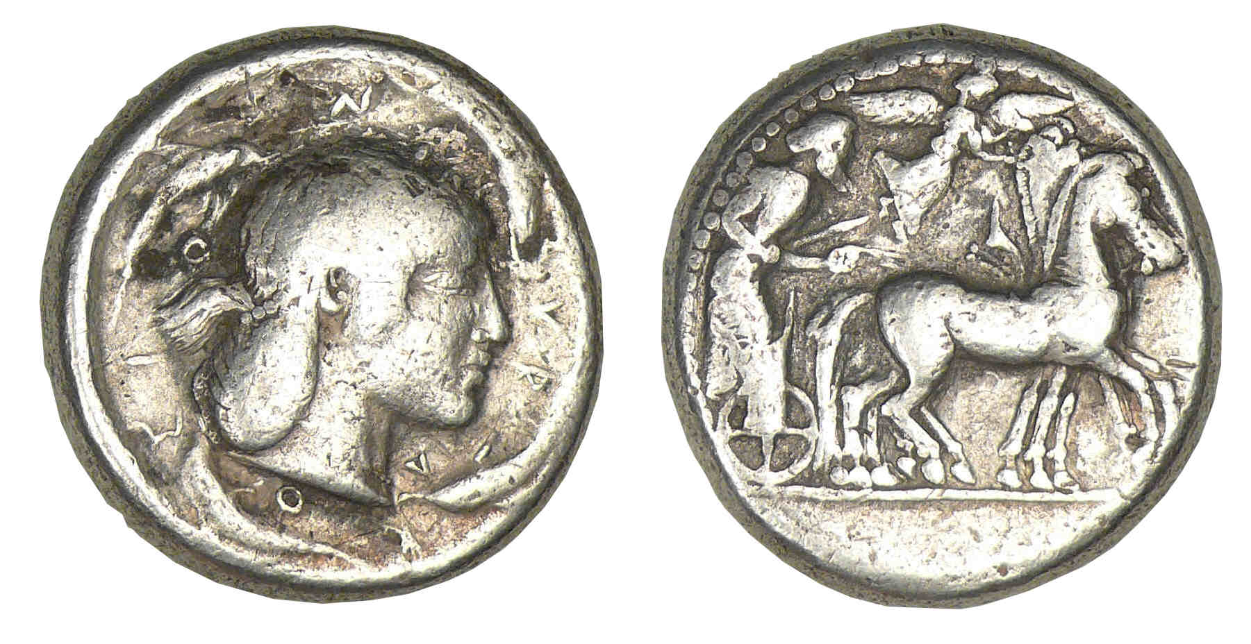 Avers : A/ ΣΥΡΑΚΟΣΙΟΝ. Tête d’Aréthuse à droite, coiffée d’un bandeau, entourée de quatre dauphins.