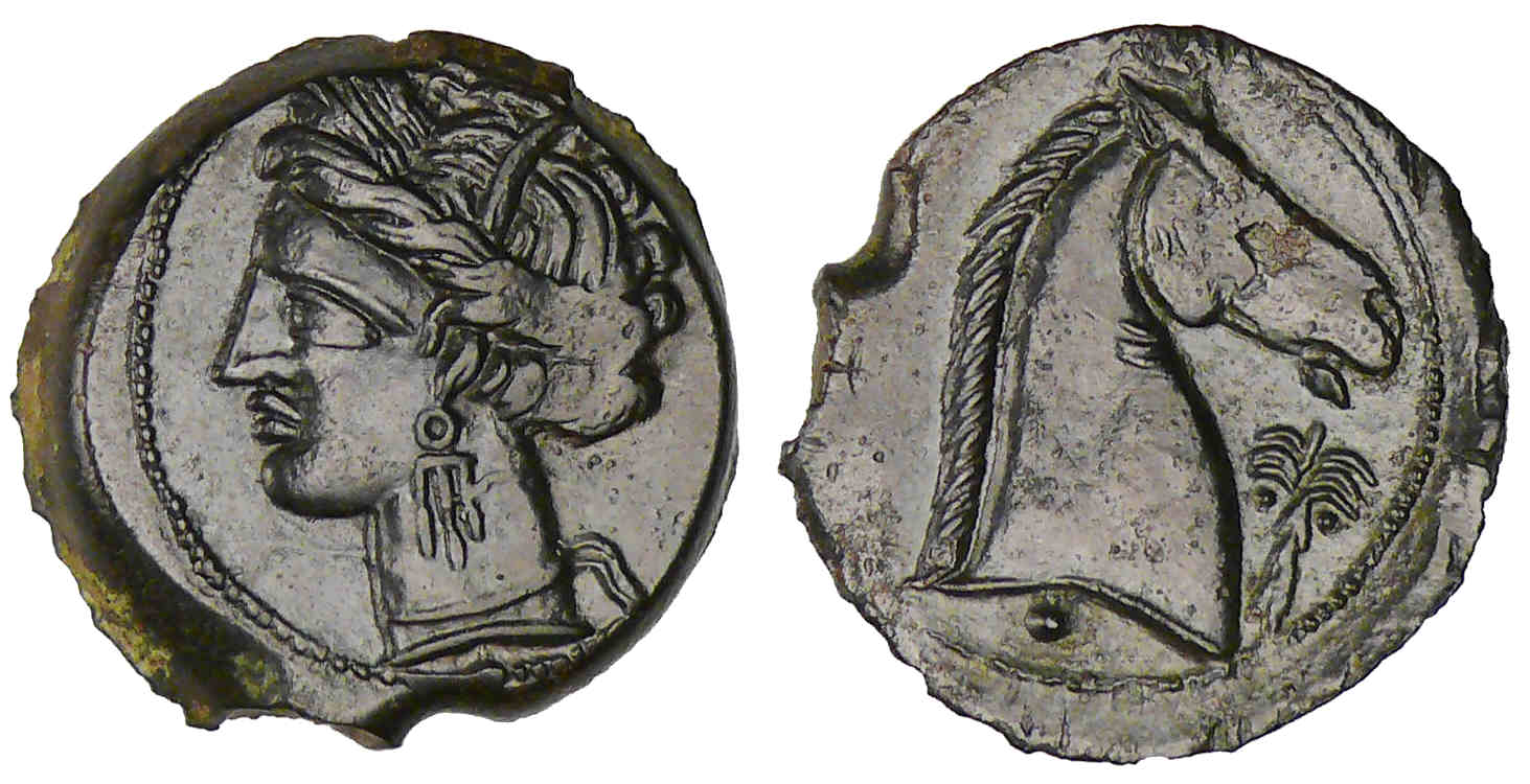 R/ Tête de cheval à droite. Un palmier devant l’encolure et un point sous la tête.