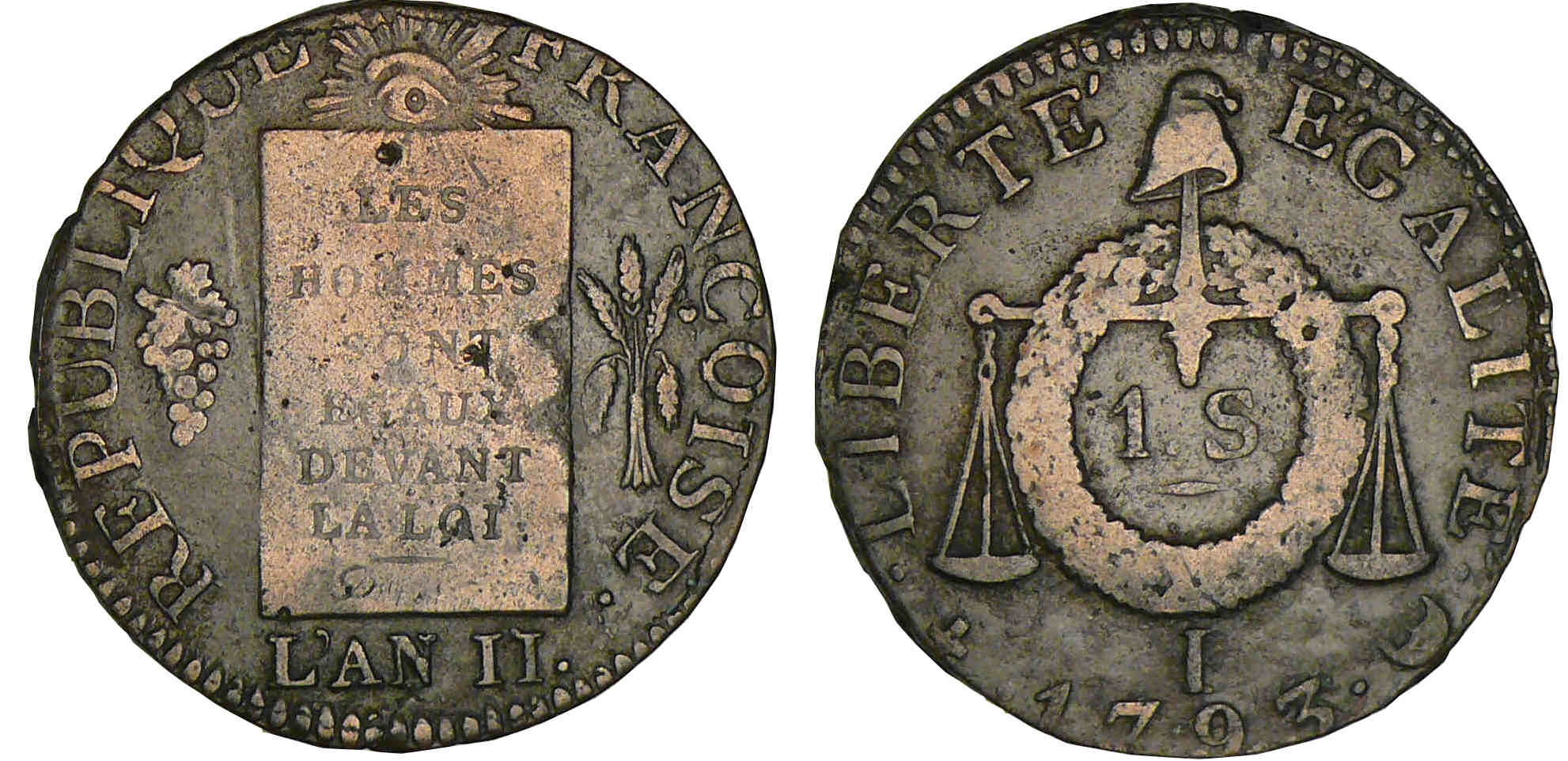 R/ Balance sommée d’un bonnet phrygien à laquelle est appendue une couronne de chêne.